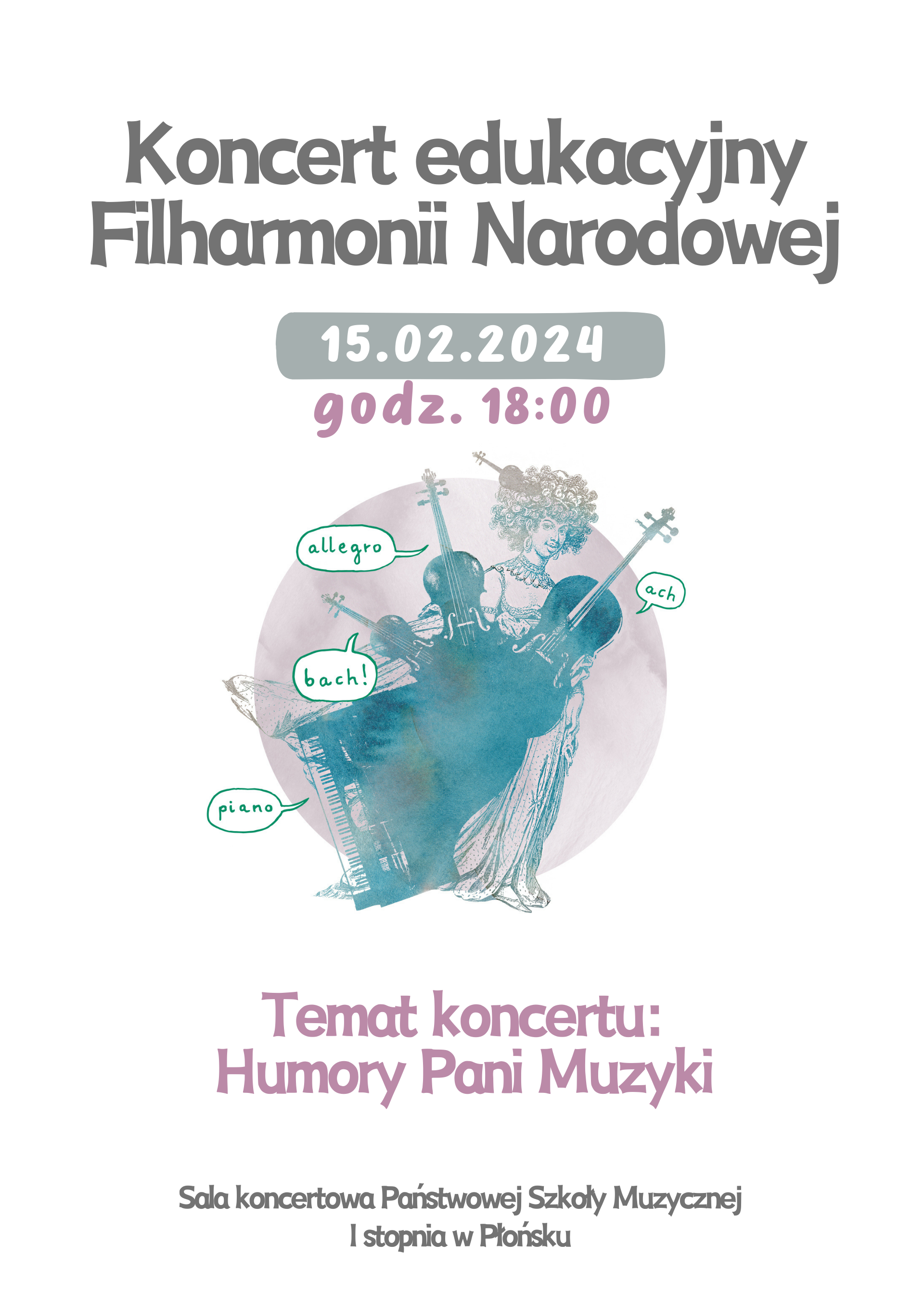 Serdecznie zapraszamy na Koncert w wykonaniu artystów Filharmonii Narodowej, który odbędzie się w dniu 15 lutego 2024 roku o godz. 18:00 w sali koncertowej Państwowej Szkoły Muzycznej I stopnia w Płońsku.