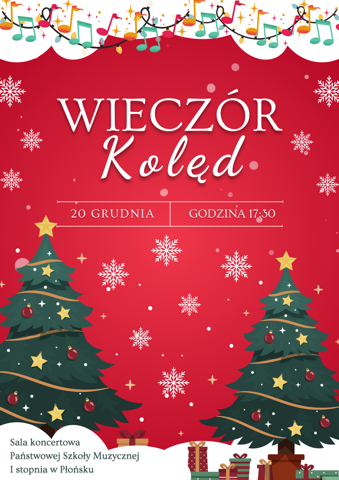 Serdecznie zapraszamy na Wieczór kolęd, który odbędzie się 20 grudnia 2023 roku (środa) o godzinie 17:30 w sali koncertowej Państwowej Szkoły Muzycznej I stopnia w Płońsku.