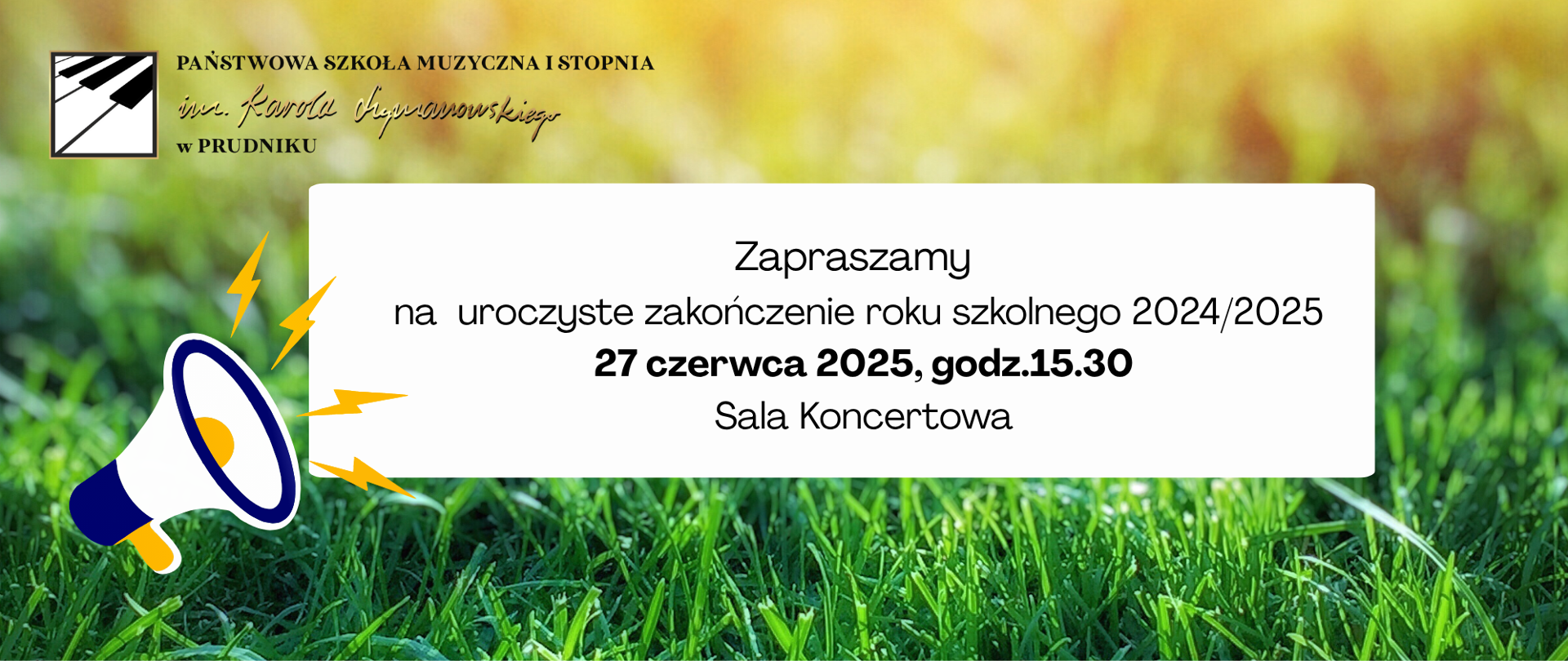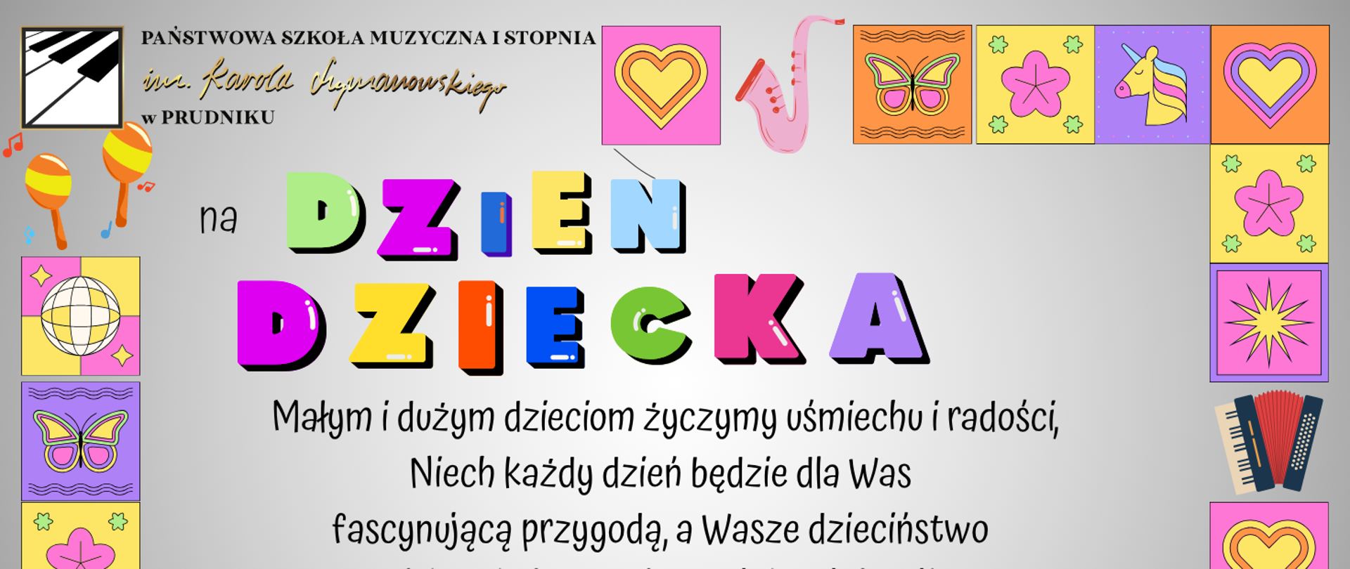 Na brązowym tle napis Rekrutacja 2025/2026. Po lewej i prawej stronie kolorowe nutki.
