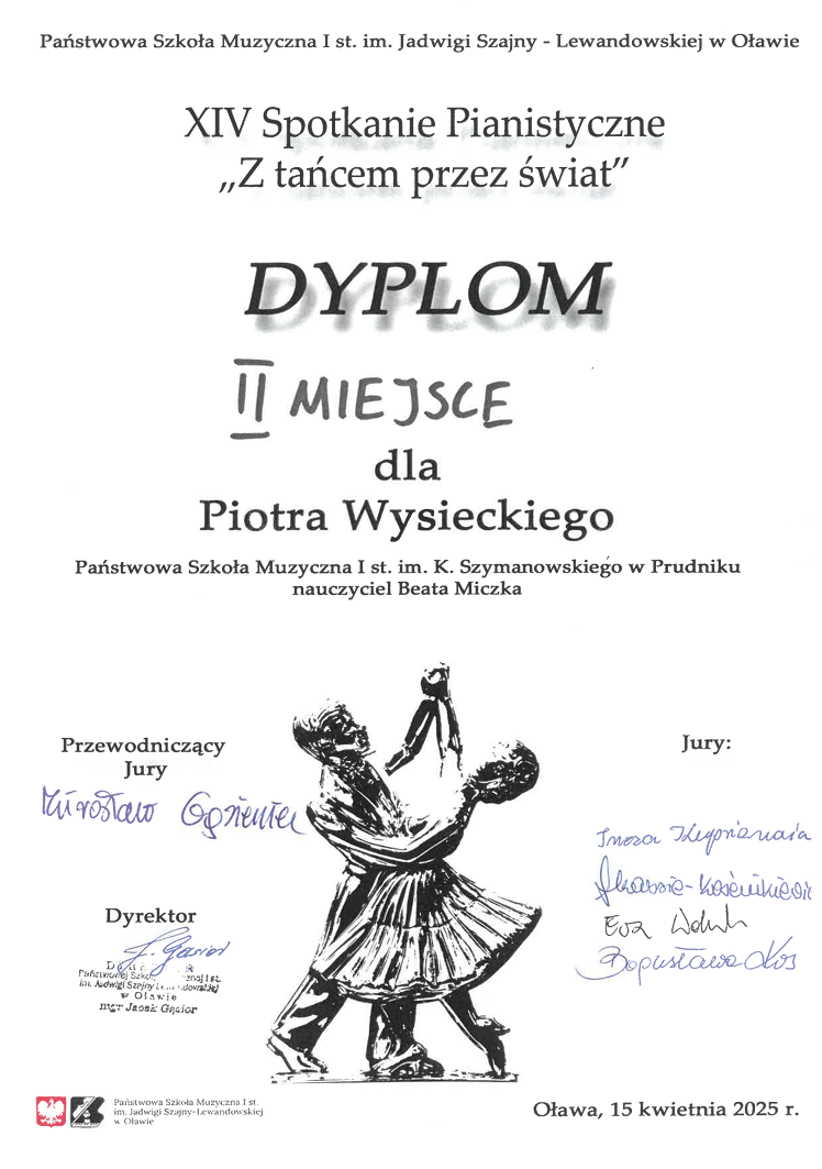 Uczeń Piotr Wysiecki z klasy fortepianu Pani Beaty Miczki zdobył II miejsce podczas XIV Spotkań Pianistycznych "Z tańcem przez świat" w Oławie.