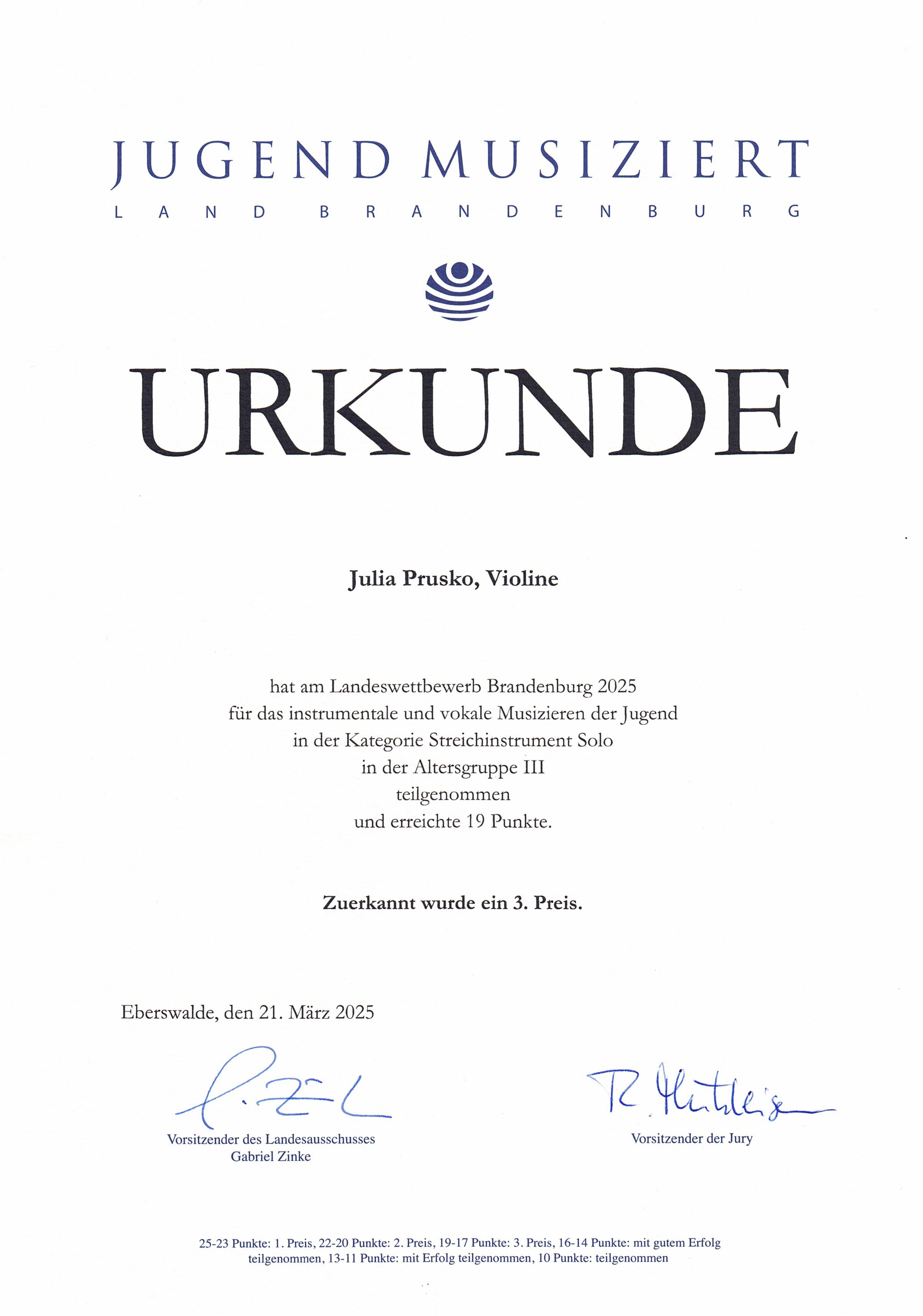 Julia Prusko z klasy skrzypiec p. Marcina Lewickiego - zdobyła I miejsce w konkursie muzycznym Jugend Musiziert - na szczeblu regionalnym we Frankfurcie i III miejsce tego samego konkursu - na szczeblu krajowym - Brandenburgia.