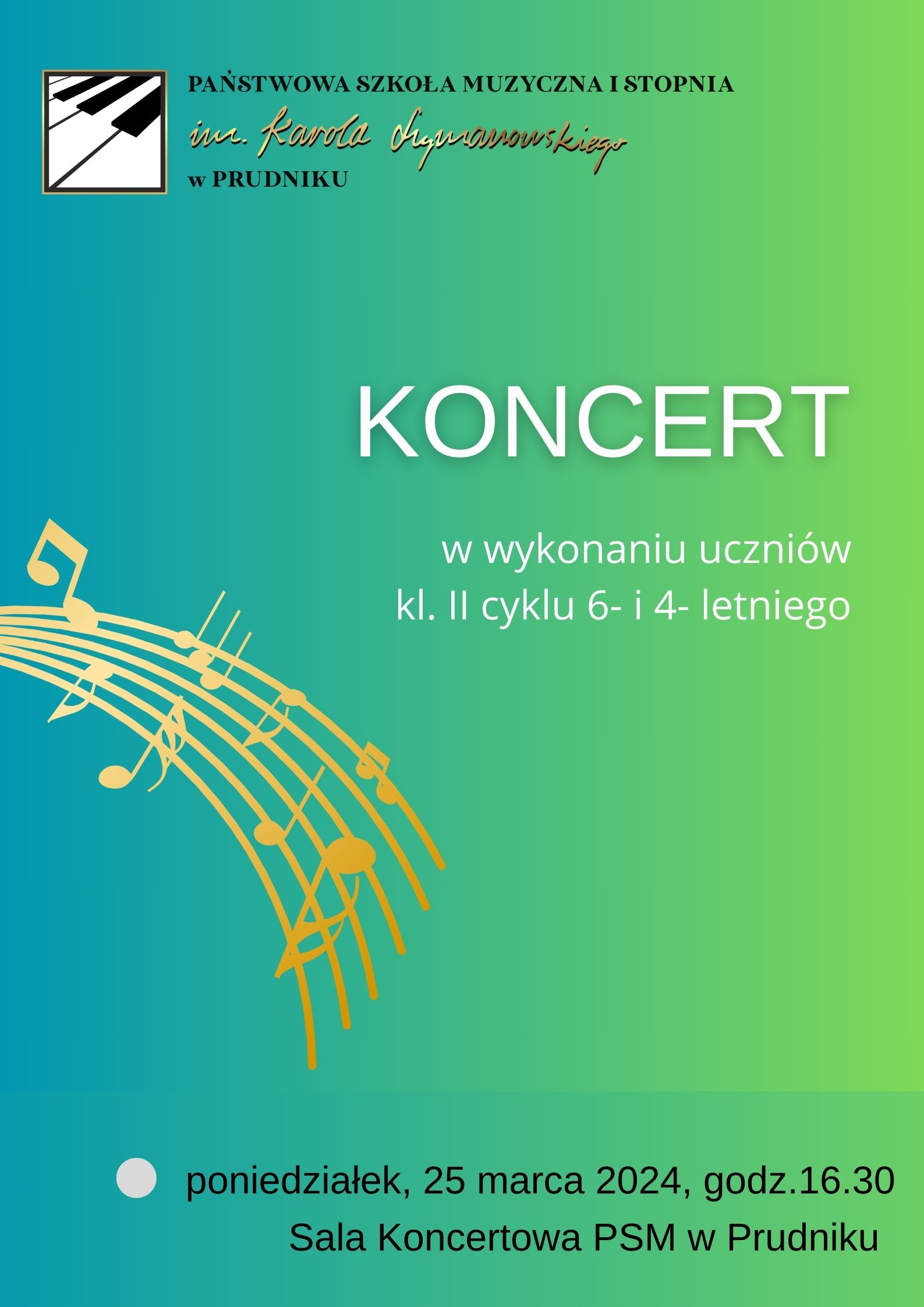Serdecznie zapraszamy na Koncert w wykonaniu uczniów klasy II cyklu 6- i 4-letniego, który odbędzie się 25 marca 2024 r. o godz. 16.30 w Sali Koncertowej PSM w Prudniku.