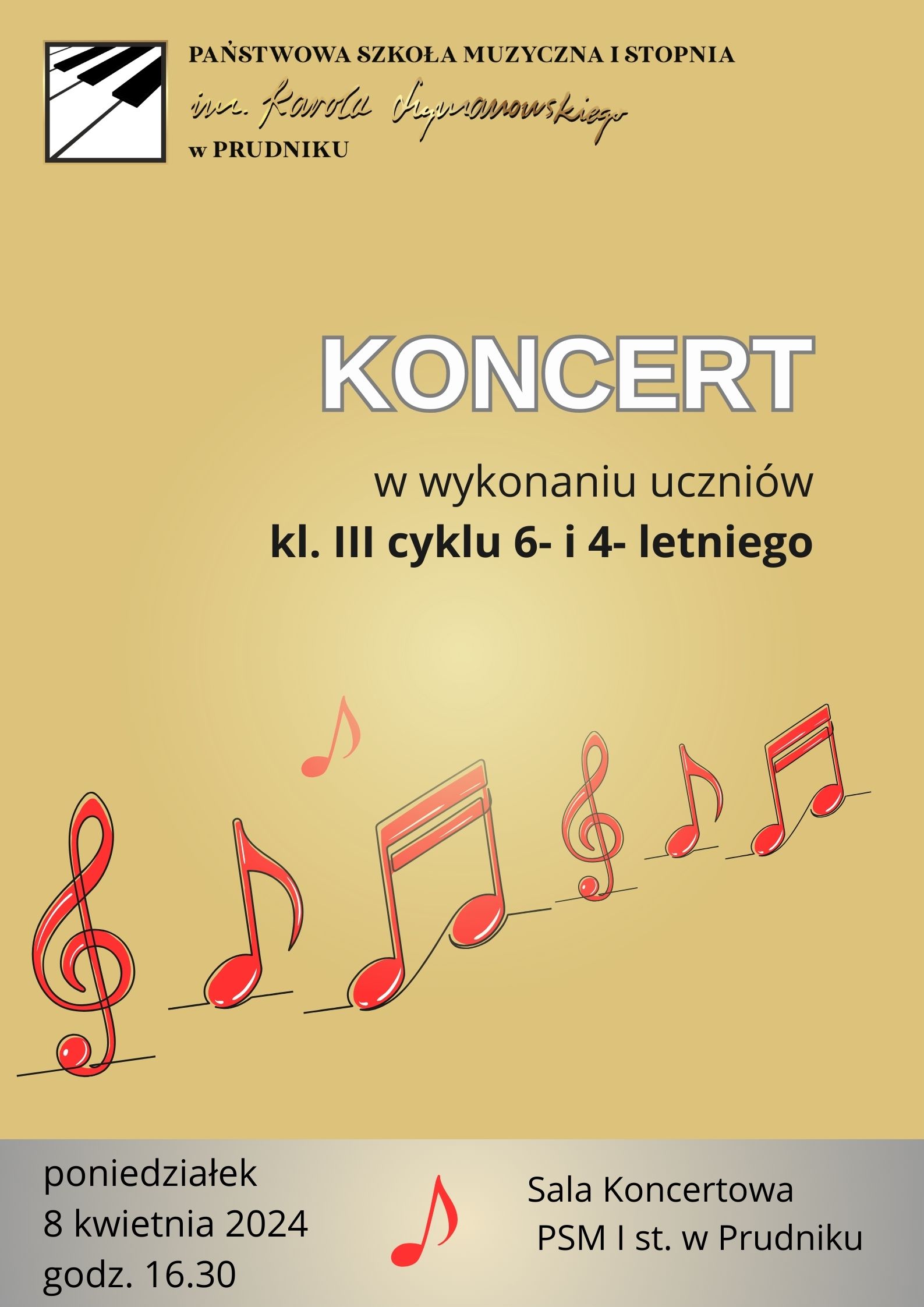 Serdecznie zapraszamy na Koncert w wykonaniu uczniów klasy III cyklu 6- i 4-letniego, który odbędzie się 8 kwietnia 2024 r. o godz. 16.30 w Sali Koncertowej PSM w Prudniku.
