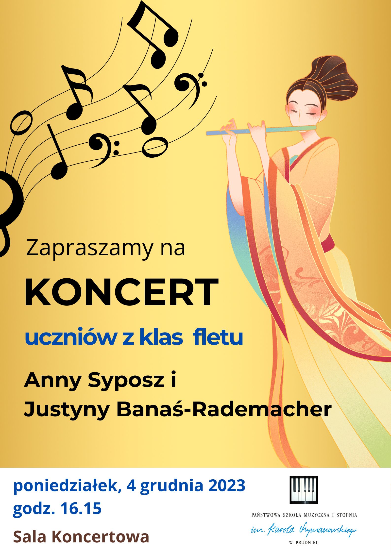 Serdecznie zapraszamy na Koncert uczniów klas fletu Anny Syposz i Justyny Banaś-Rademacher, który odbędzie się 4 grudnia 2023 r. o godz. 16.15 w Sali Koncertowej przy PSM I st. w Prudniku.