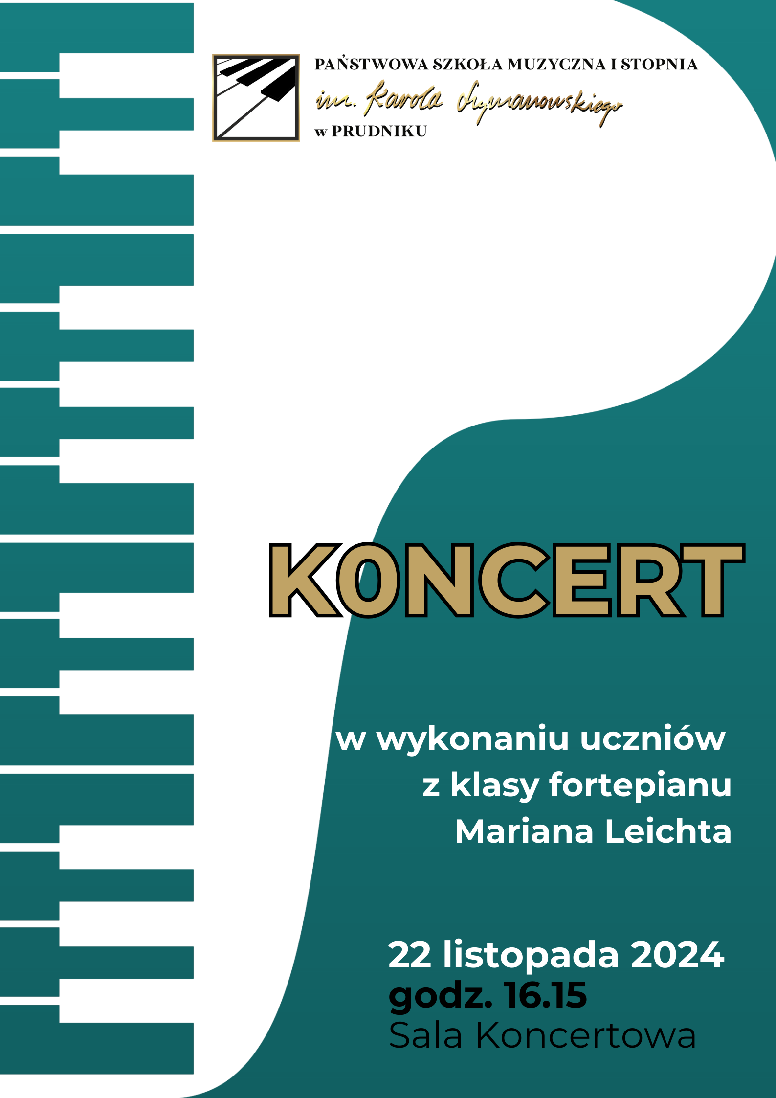 Serdecznie zapraszamy na koncert w wykonaniu uczniów klasy fortepianu Mariana Leichta, który odbędzie się 22 listopada 2024 r. o godz. 16.15 w Sali koncertowej.