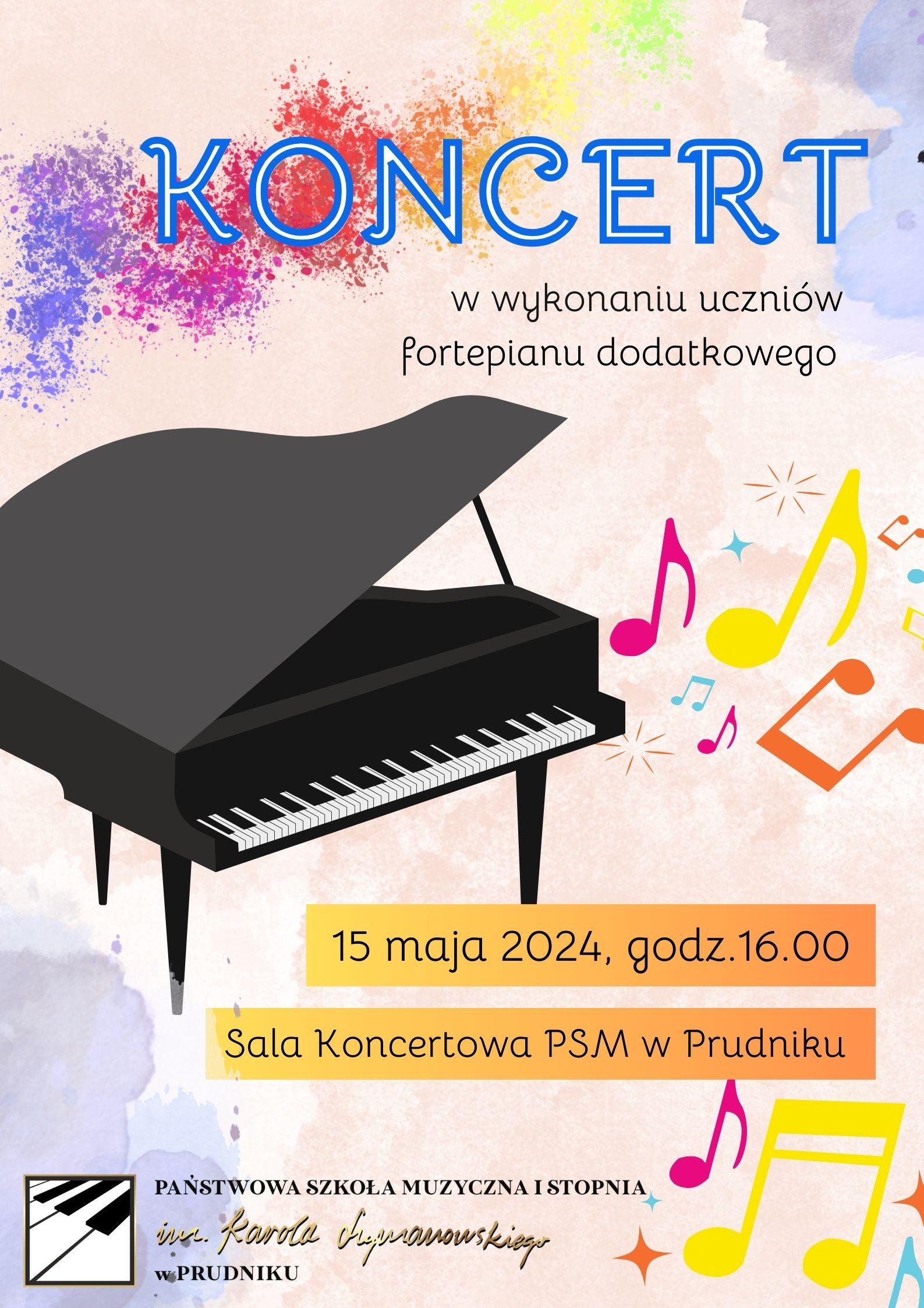 Serdecznie zapraszamy na koncert w wykonaniu uczniów fortepianu dodatkowego, który odbędzie się 15 maja 2024 r. o godz. 16.00 w Sali koncertowej.