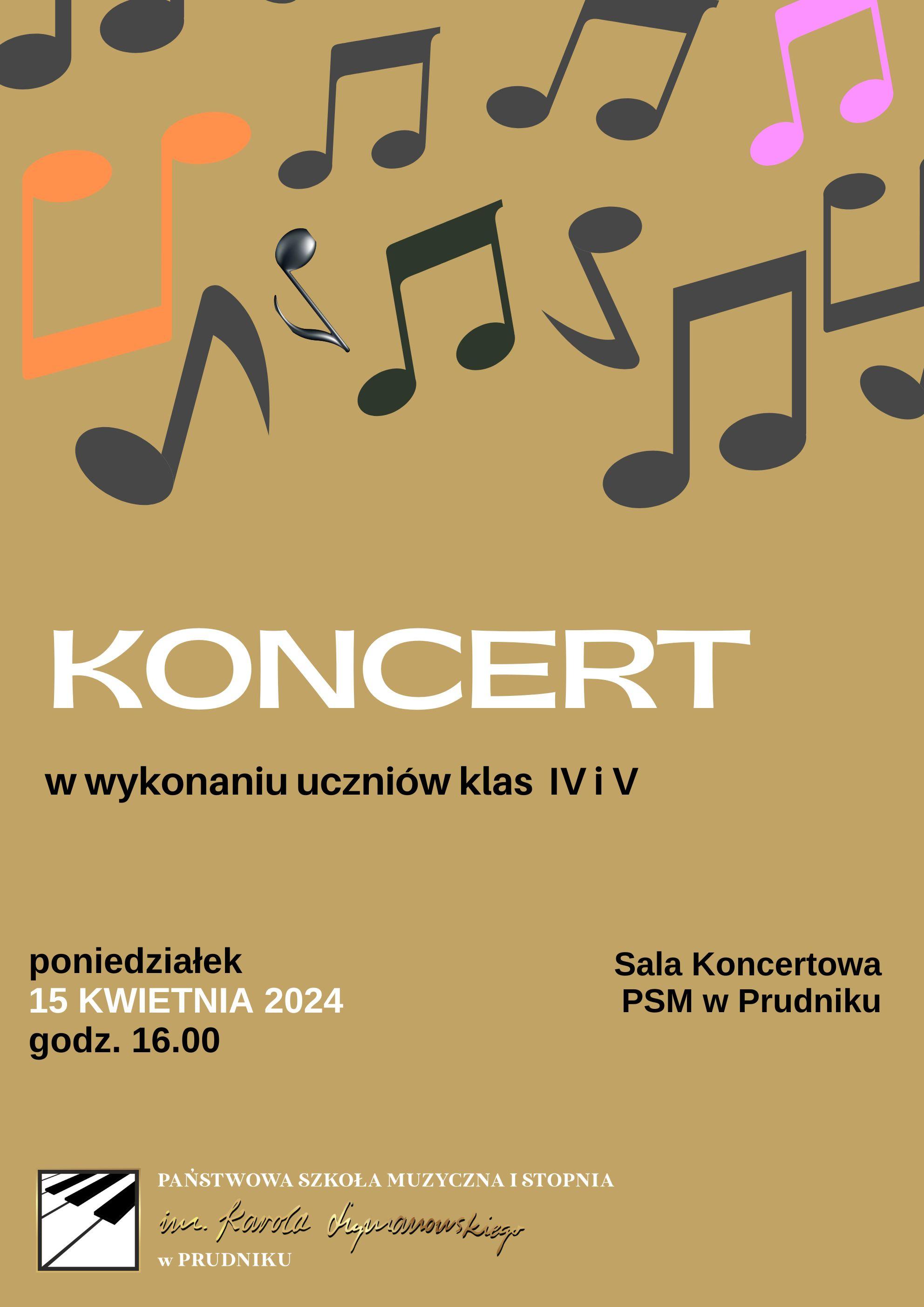 Serdecznie zapraszamy na koncert uczniów kl. IV i V, który odbędzie się w poniedziałek 15 kwietnia 2024 r. o godz. 16.00 w Sali Koncertowej PSM I st. w Prudniku.