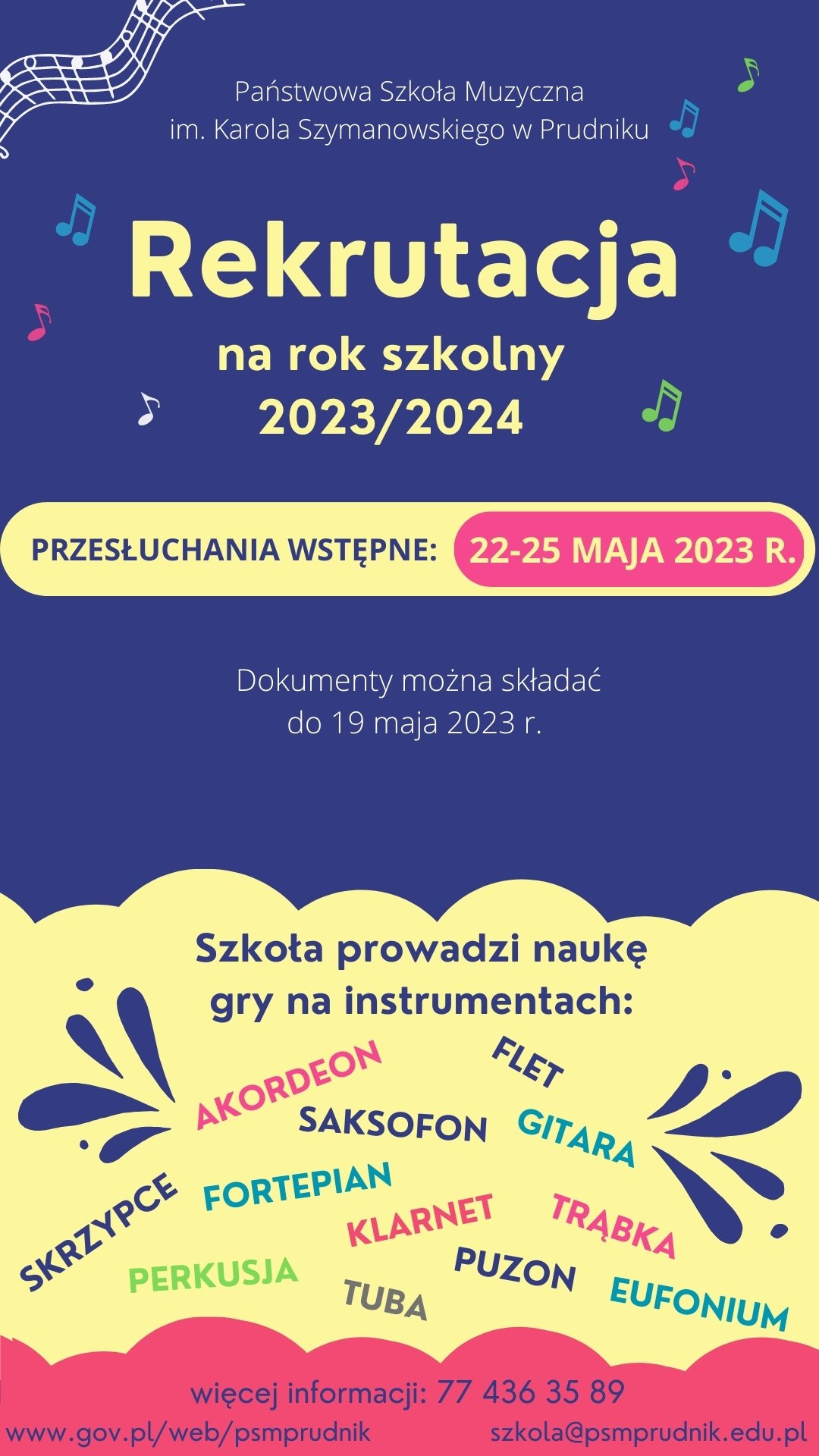 Państwowa Szkoła Muzyczna I stopnia im. Karola Szymanowskiego w Prudniku zaprasza wszystkich chętnych do zapoznania się z informacjami dotyczącymi rekrutacji na rok szkolny 2023/2024.