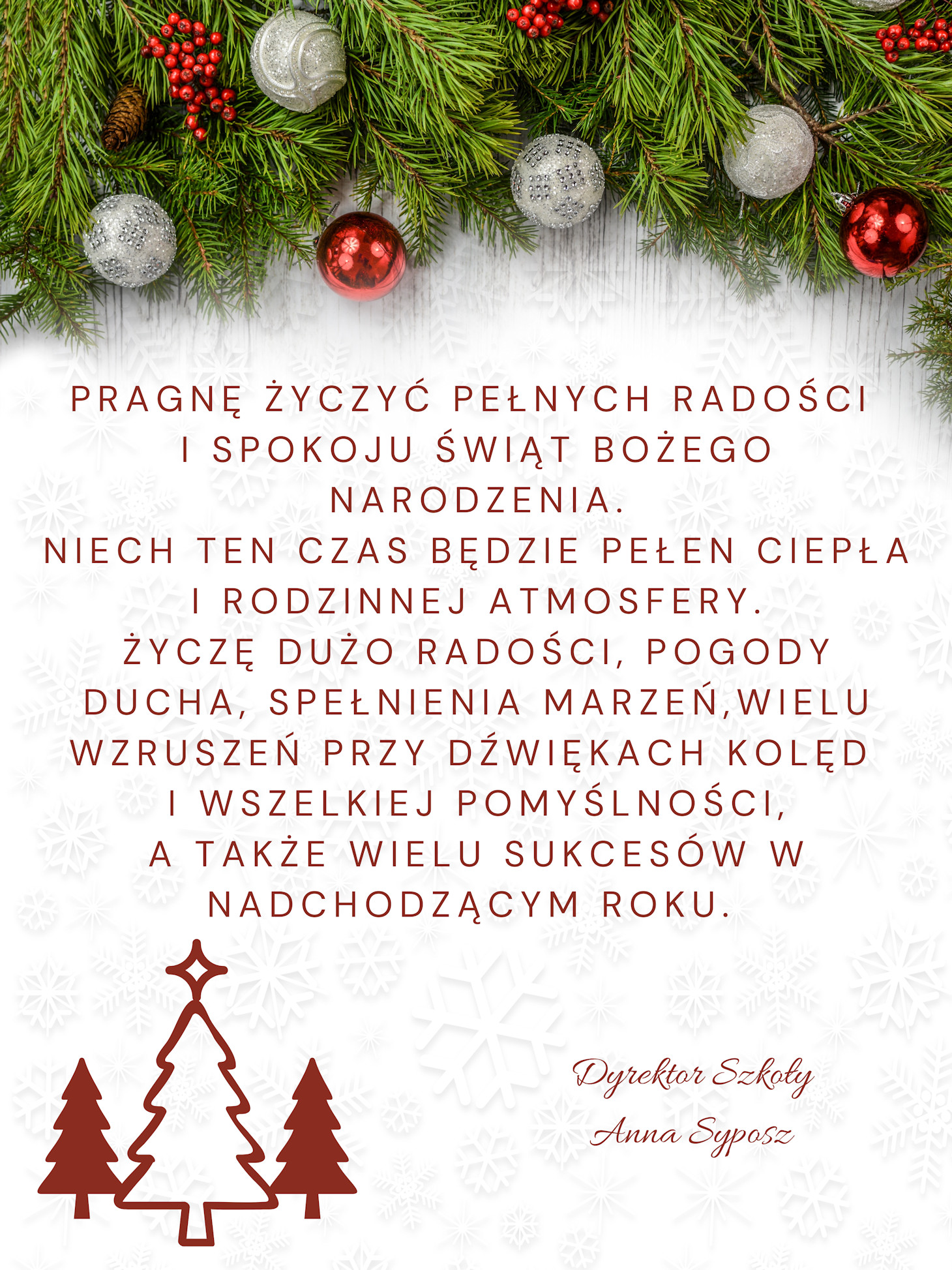 Pragnę życzyć pełnych radości i spokoju Świąt Bożego Narodzenia. Niech ten czas będzie pełen ciepła i rodzinneh atmosfery. Życzę dużo radości, pogody ducha, spełnienia marzeń, wielu wzruszeń przy dźwiękach kolęd i wszelkiej pomyślnosci, a także wielu sukcesów w nadchodzącym roku.