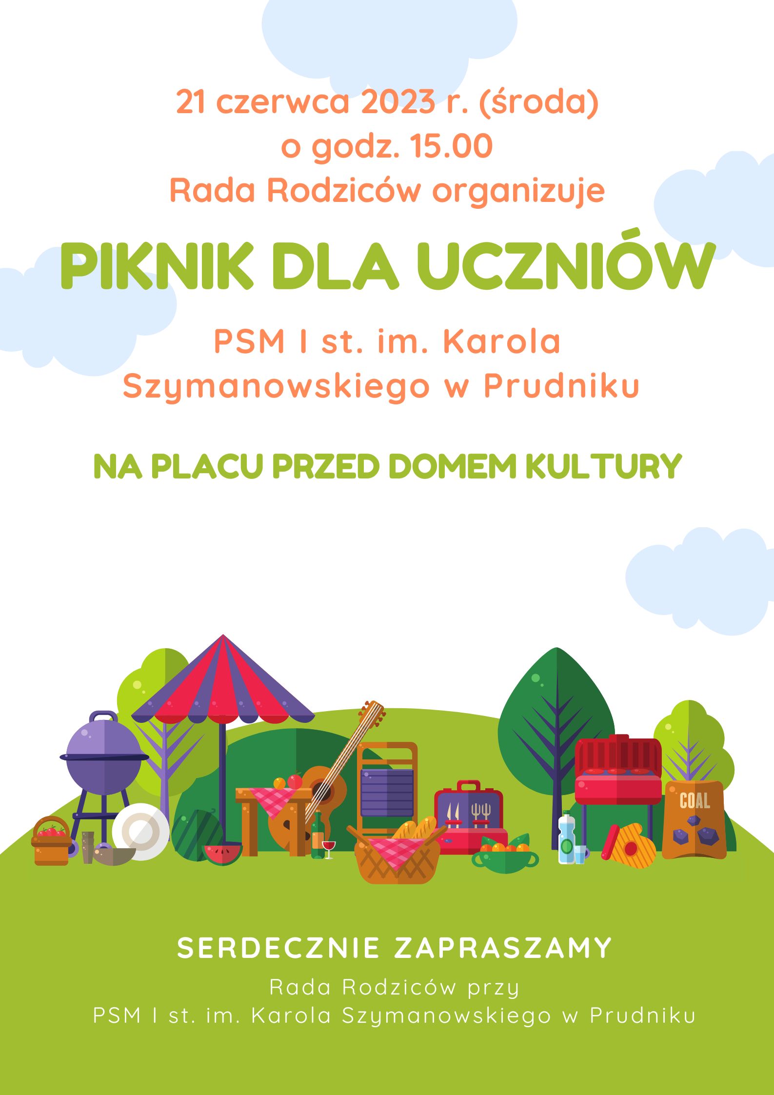 21 czerwca 2023 r. (środa) o godz. 15.00 Rada Rodziców organizuje Piknik dla uczniów PSM I st. im. Karola Szymanowskiego w Prudniku na placu przed domem kultury.