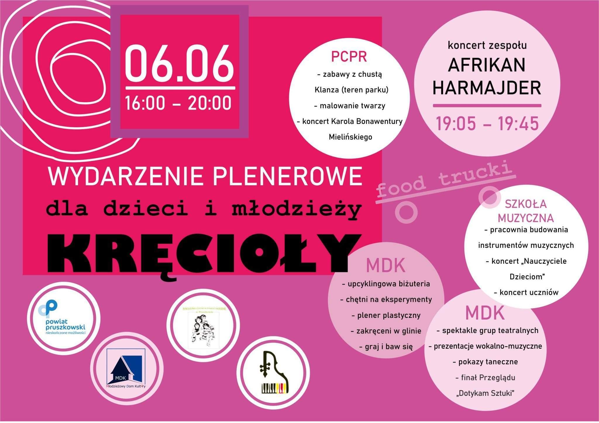 Serdecznie zapraszamy 6.06.2024 r. w godzinach 16.00 – 20.00 do Parku Miejskiego im. T. Kościuszki w Pruszkowie na wydarzenie plenerowe dla dzieci i młodzieży „KRĘCIOŁY”.