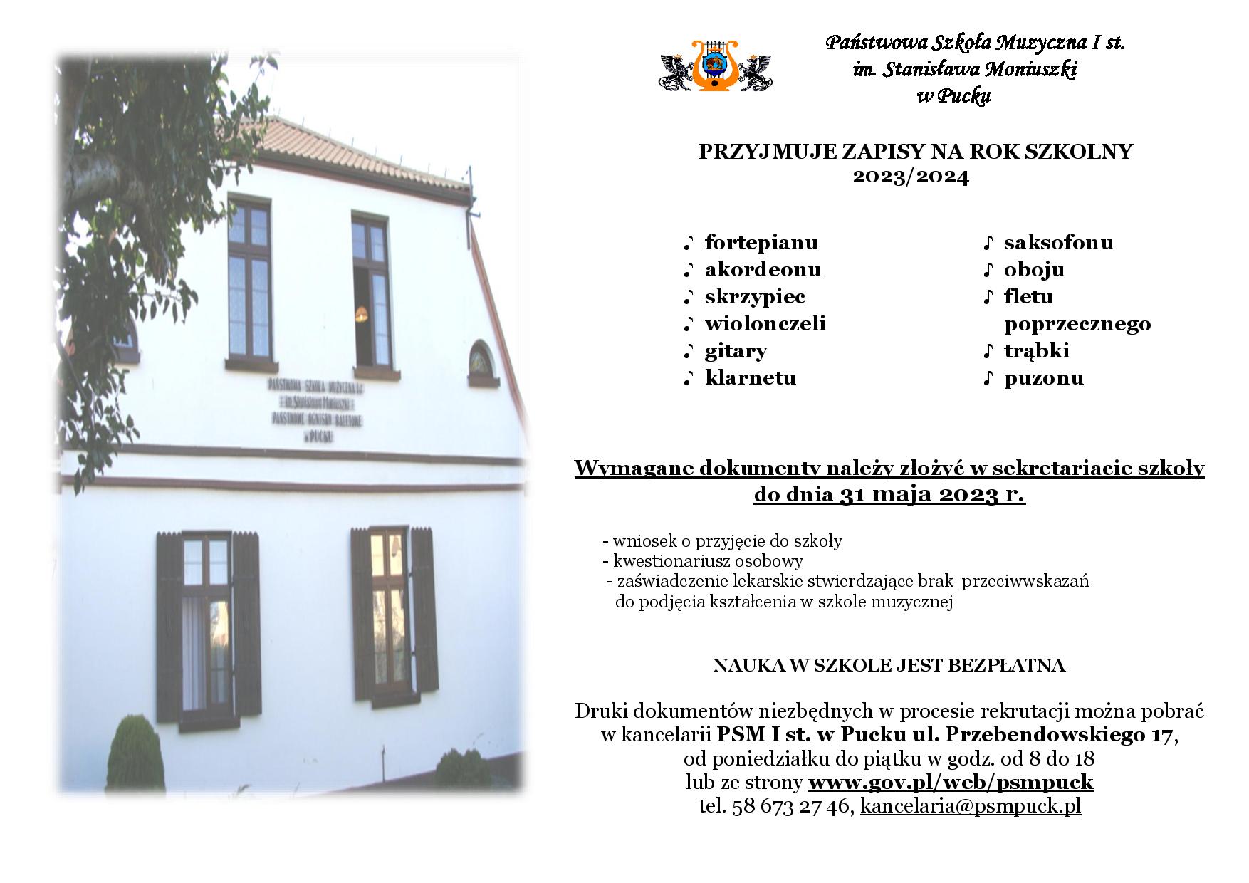 Państwowa Szkoła Muzyczna I stopnia im. Stanisława Moniuszki w Pucku przeprowadza co roku rekrutację kandydatów do klas pierwszych.