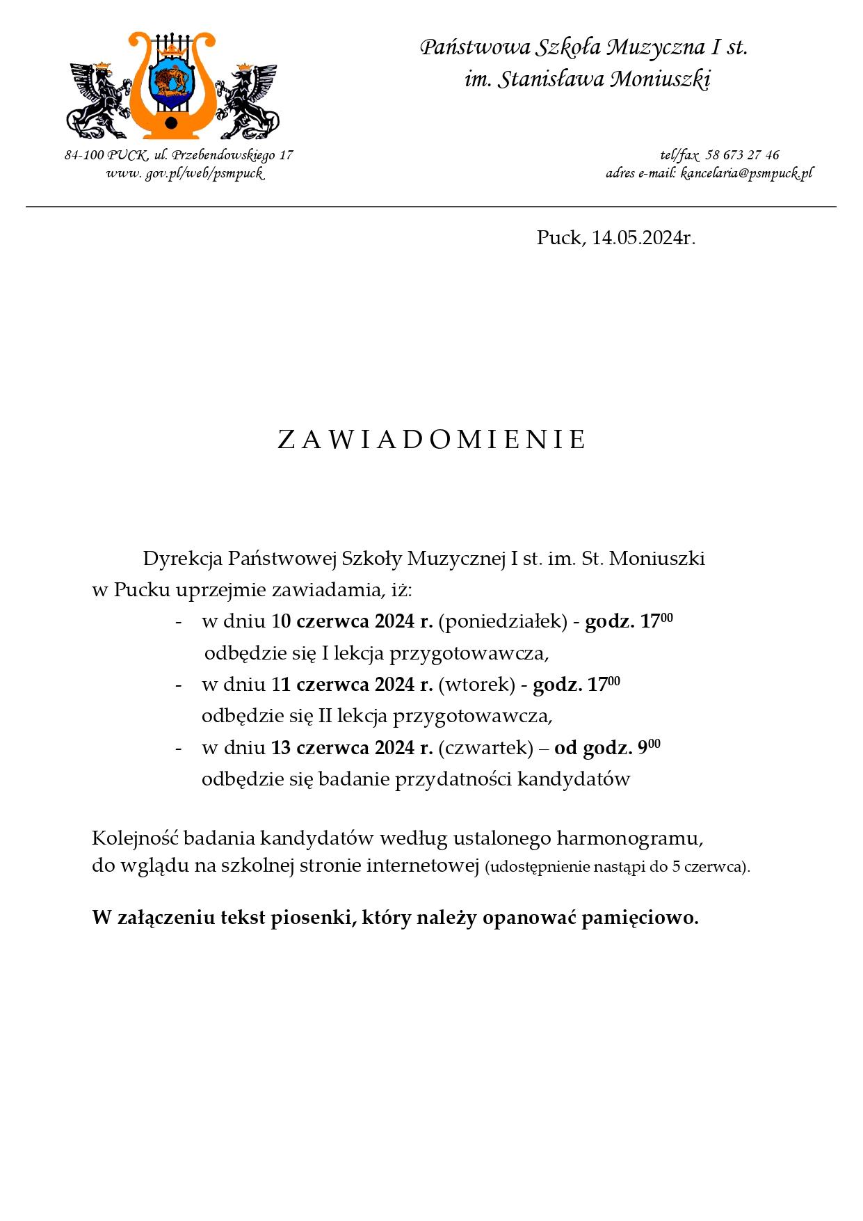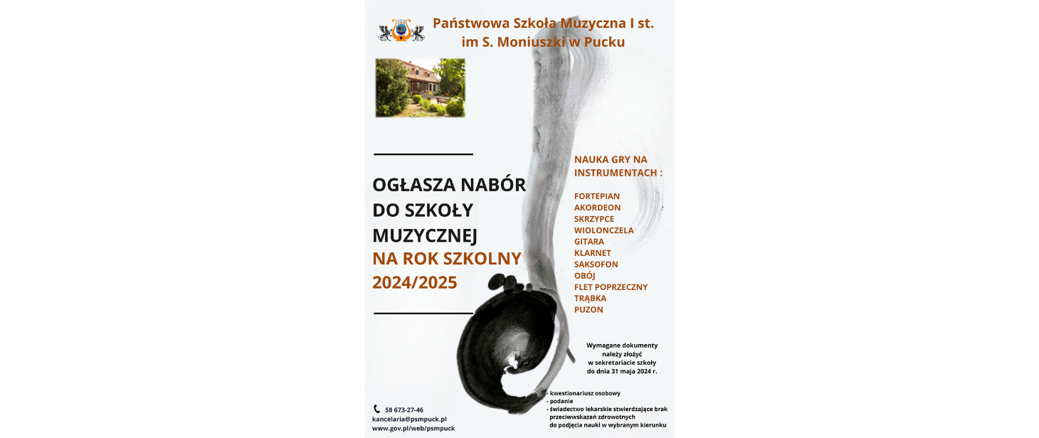 W dniu 21 czerwca 2024 r. w budynku Szkoły została wywieszona lista osób zakwalifikowanych i niezakwalifikowanych do Państwowej Szkoły Muzycznej I stopnia im. S. Moniuszki w Pucku.