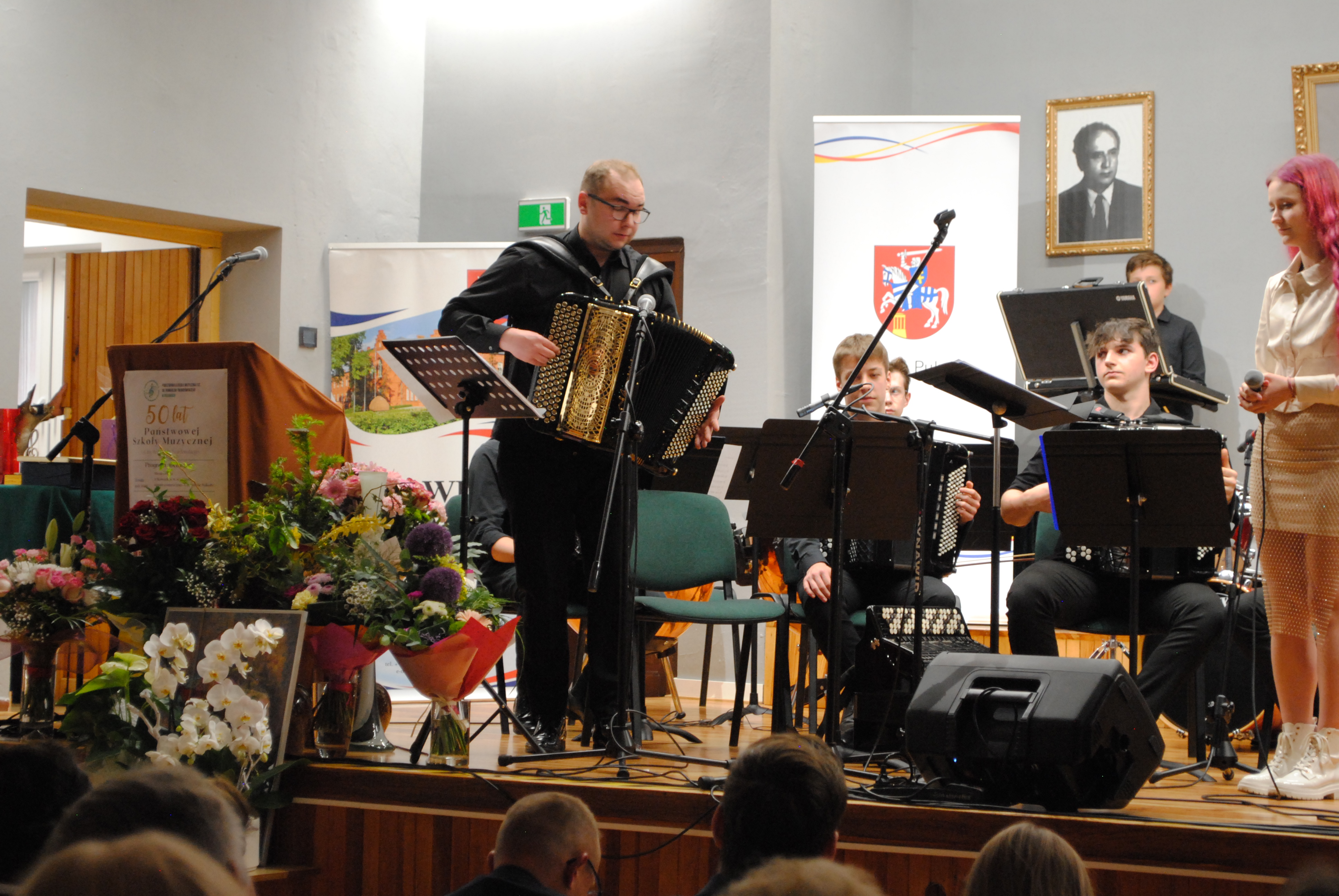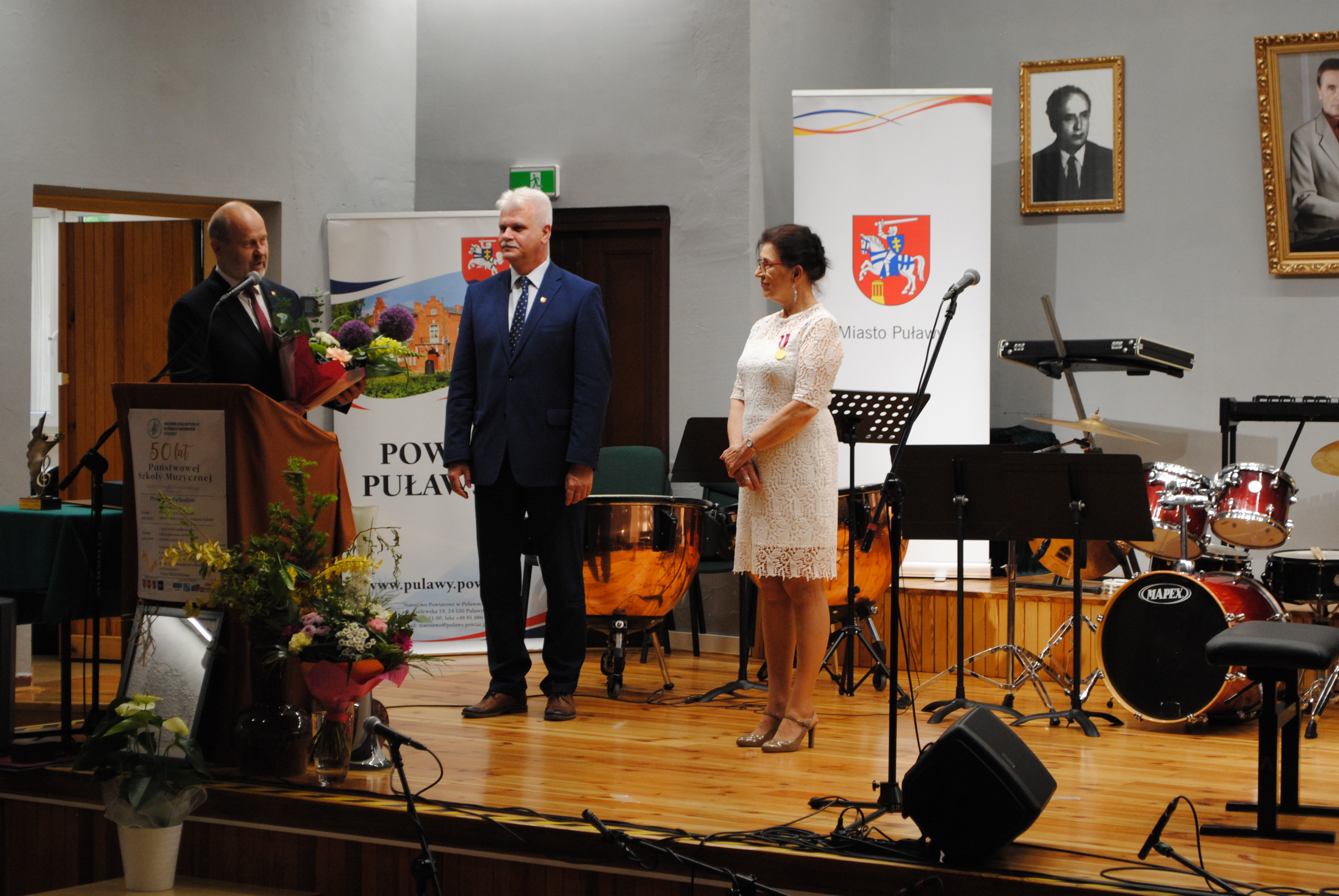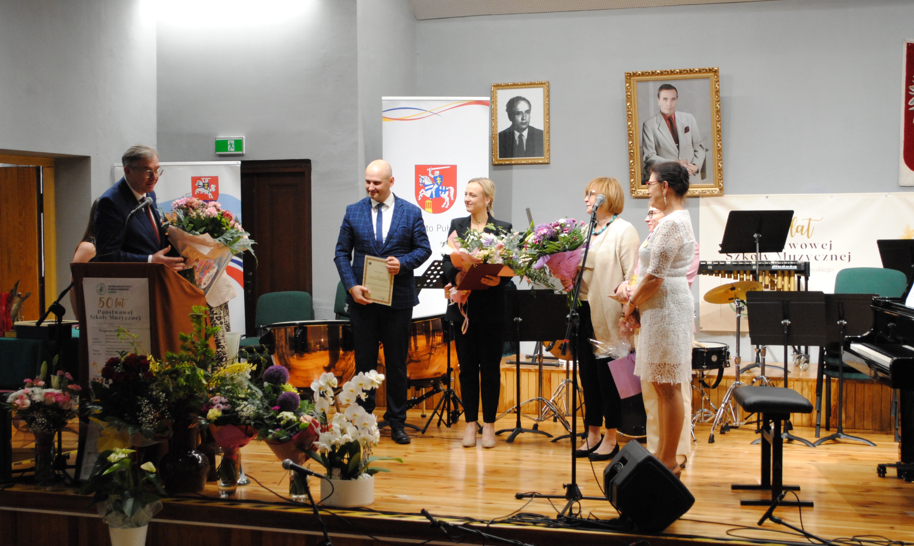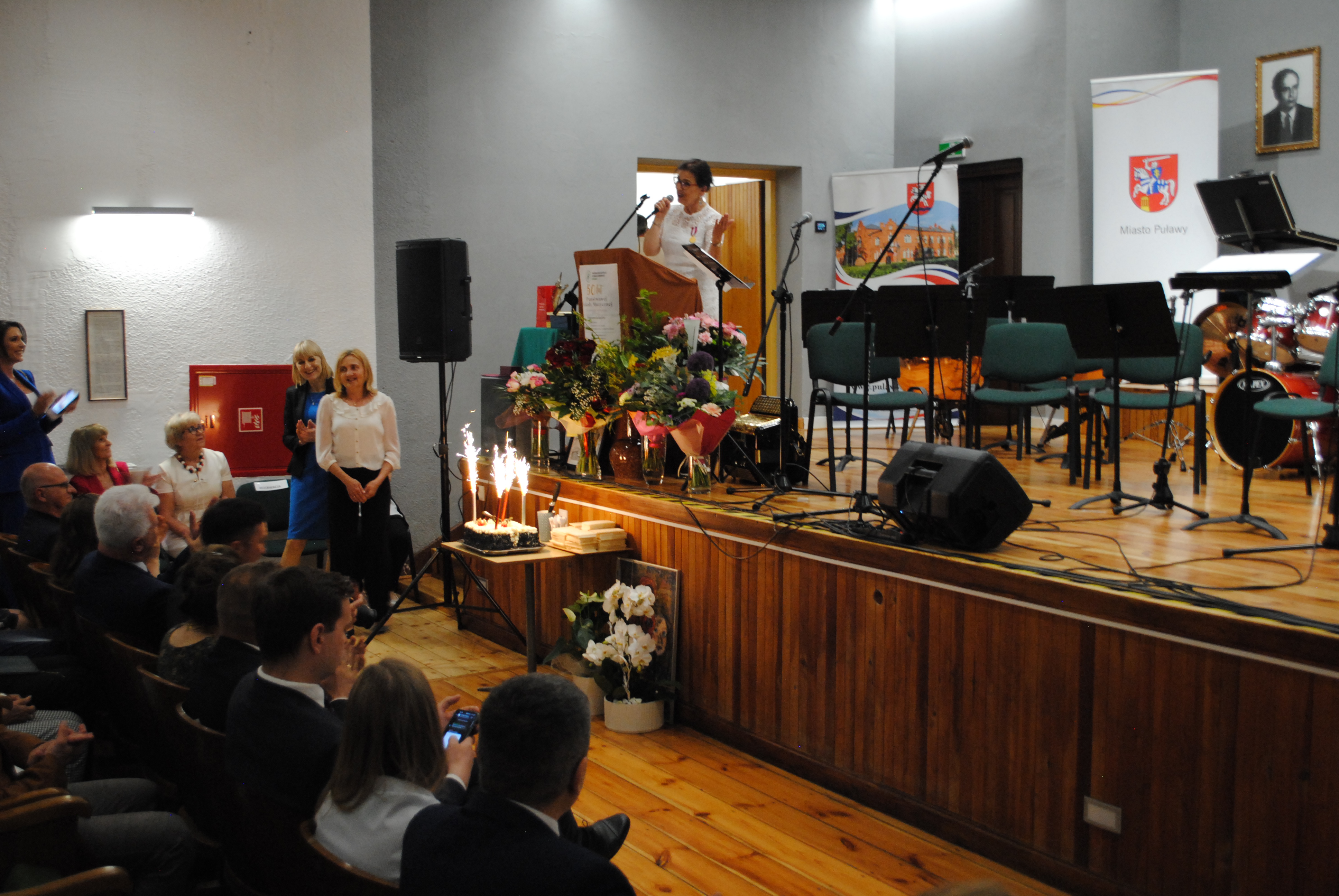 Pani dyrektor Stanisława Małgorzata Ziemnicka rozpoczęła uroczystość od powitania przybyłych gości i poprosiła p. wizytator Agnieszkę Weiner o wręczenie nagród dyrektora CEA za szczególny wkład w rozwój edukacji muzycznej w Polsce. Nauczycieli nagrodzono również nagrodami dyrektora za osiągnięcia dydaktyczne w obecnym roku szkolnym. Przedstawiciele władz przekazali wyrazy uznania za działalność szkoły, wręczyli na ręce pani dyrektor kwiaty i listy gratulacyjne. Następnie p. Maria Grabiec przybliżyła kalendarium najważniejszych wydarzeń z życia szkoły na przestrzeni minionych 50 lat i poprowadziła koncert, podczas którego zaprezentowali się: