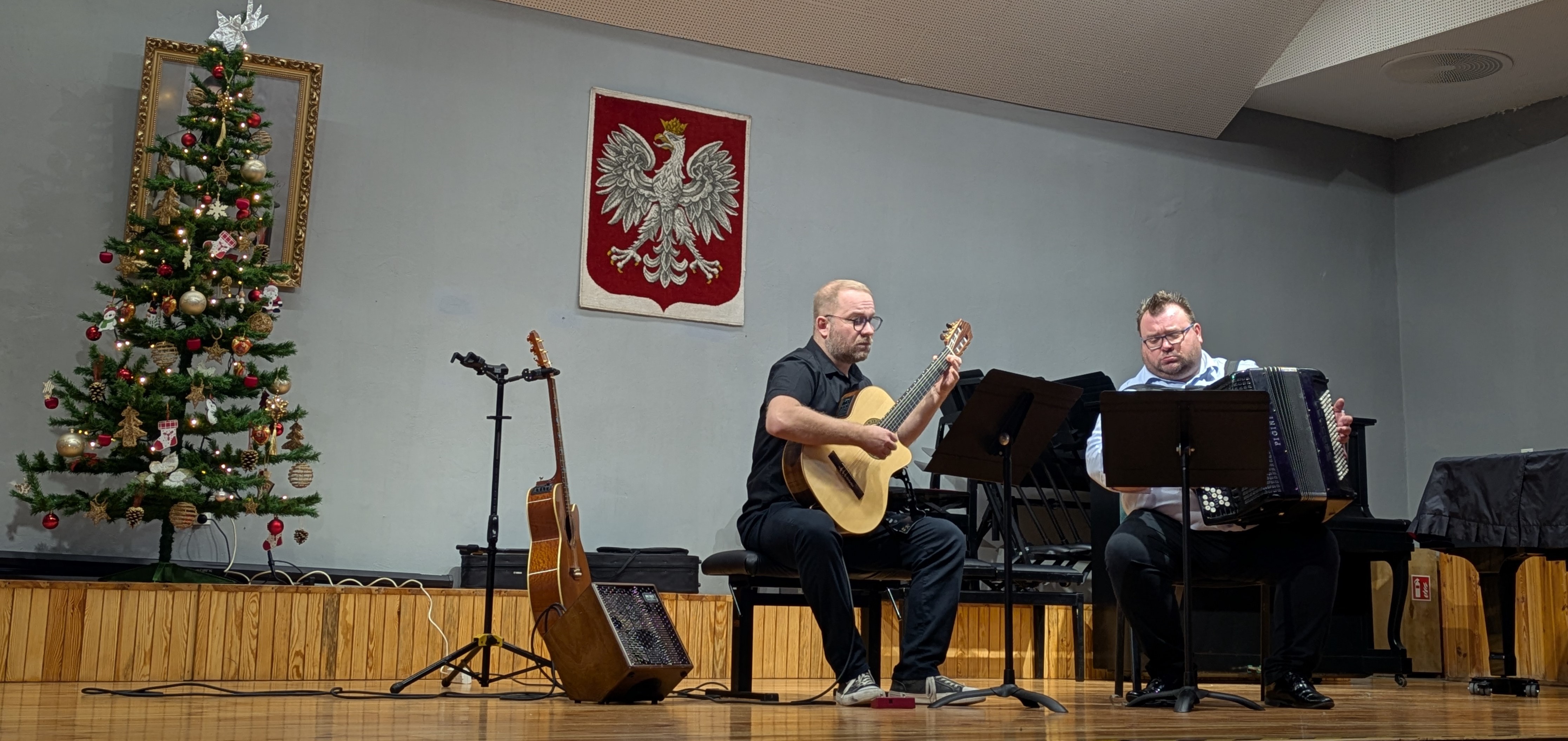 10 grudnia 2024 r. odbyły się w naszej szkole warsztaty gitarowe i akordeonowe, podczas których uczniowie mieli okazję doskonalić swoje umiejętności wykonawcze. Zwieńczeniem wydarzenia był wyjątkowy koncert Andrzeja Olewińskiego (gitara) i Rafała Grząki (akordeon) z Uniwersytetu Muzycznego Fryderyka Chopina w Warszawie, który był prawdziwą wędrówką poprzez rozmaite gatunki i style muzyczne - począwszy od Jana Sebastiana Bacha, poprzez Astora Piazzollę, aż po autorskie kompozycje i aranżacje najbardziej znanych dzieł. Muzyka w wykonaniu prawdziwych mistrzów zachwyciła publiczność i pozostanie w naszych wspomnieniach przez długi czas.