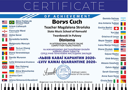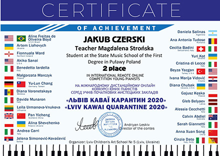 Podczas Międzynarodowego Projektu Festiwalowego "Kalejdoskop Talentów", który odbył się online w maju 2021 r. Jakub Czerski, uczeń p. Magdaleny Strońskiej został laureatem I stopnia.