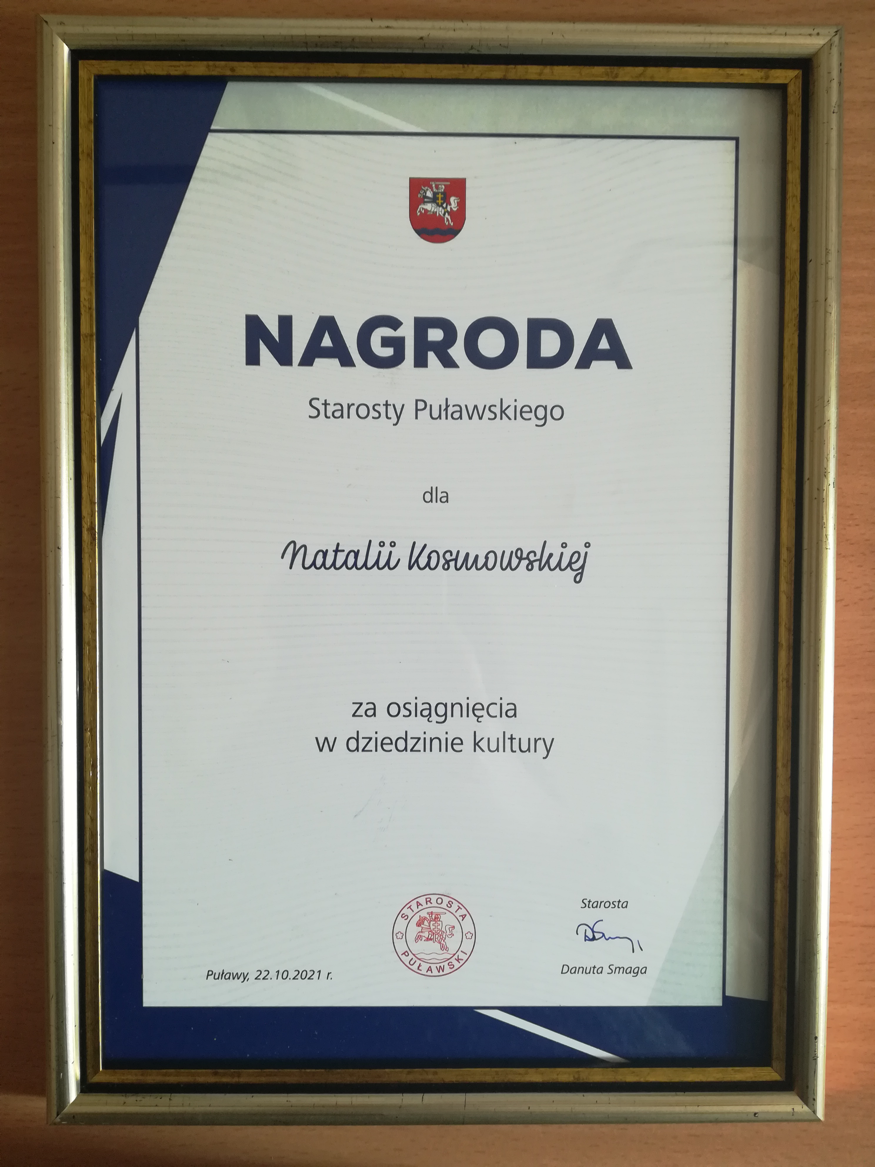 22 paźdzernika 2021 r. w hali sportowej Zespołu Szkół Technicznych w Puławach odbyły się uroczyste obchody 21. Powiatowego Dnia Kultury, podczas którego wręczono nagrody Starosty Puławskiego za osiągnięcia kulturalne. Jedną z nich otrzymała uczennica naszej szkoły, Natalia Kosmowska z klasy fortepianu p. Rafała Maciąga. W imieniu Natalii nagrodę odebrała Pani Dyrektor Stanisława Małgorzata Ziemnicka.