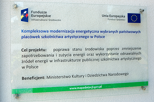 Budynek naszej placówki został objęty programem pn. „Kompleksowa modernizacja energetyczna wybranych państwowych placówek szkolnictwa artystycznego w Polsce”, który jest finansowany ze środków Unii Europejskiej(Funduszu Spójności) w ramach Programu Operacyjnego Infrastruktura i Środowisko 2014 – 2020 oraz środków MKiDN – budżetu państwa.