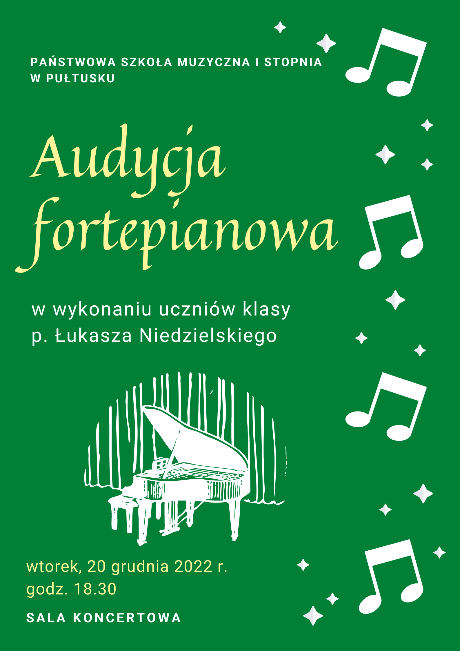 Zapraszamy na audycję fortepianową w wykonaniu uczniów klasy p. Łukasza Niedzielskiego w dniu 20 grudnia 2022 r.