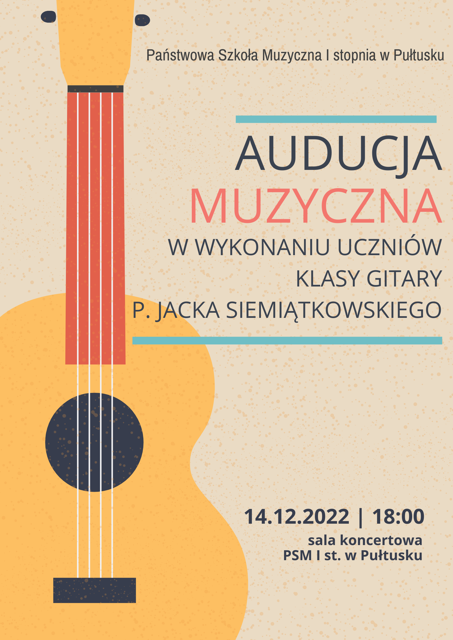 Zapraszamy na audycję muzyczną w wykonaniu uczniów klasy gitary p. Jacka Siemiątkowskiego w dniu 14.12.2022 r.