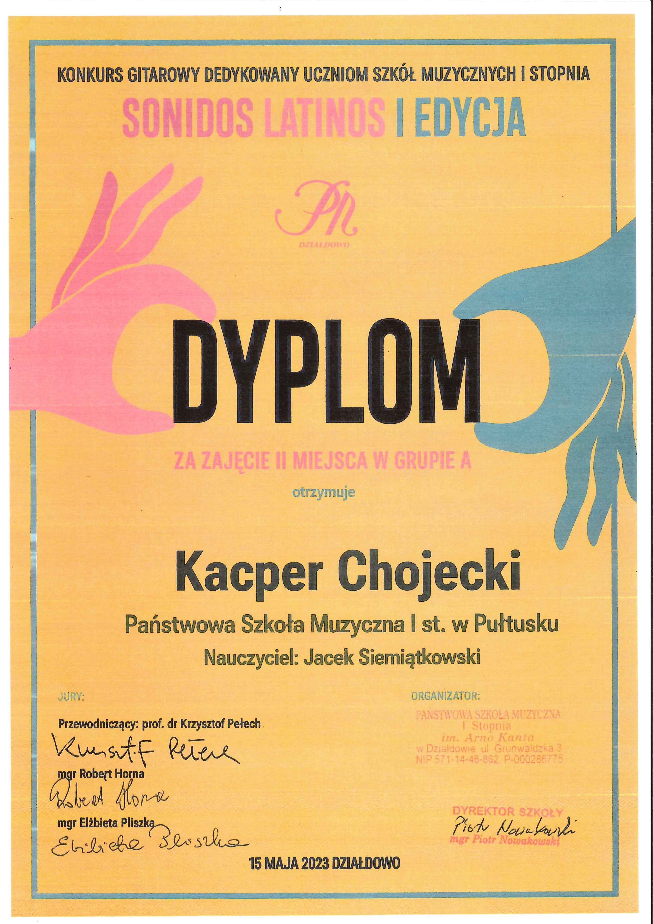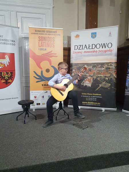 Kolejny sukces naszego zdolnego, młodego gitarzysty! Brawo dla Kacpra Chojeckiego ucznia klasy pierwszej cyklu sześcioletniego. Tym razem Kacper zdobył II nagrodę na Ogólnopolskim Konkursie Gitarowym ,,Sonidos Latinos'' organizowanym w PSM I st. w Działdowie.