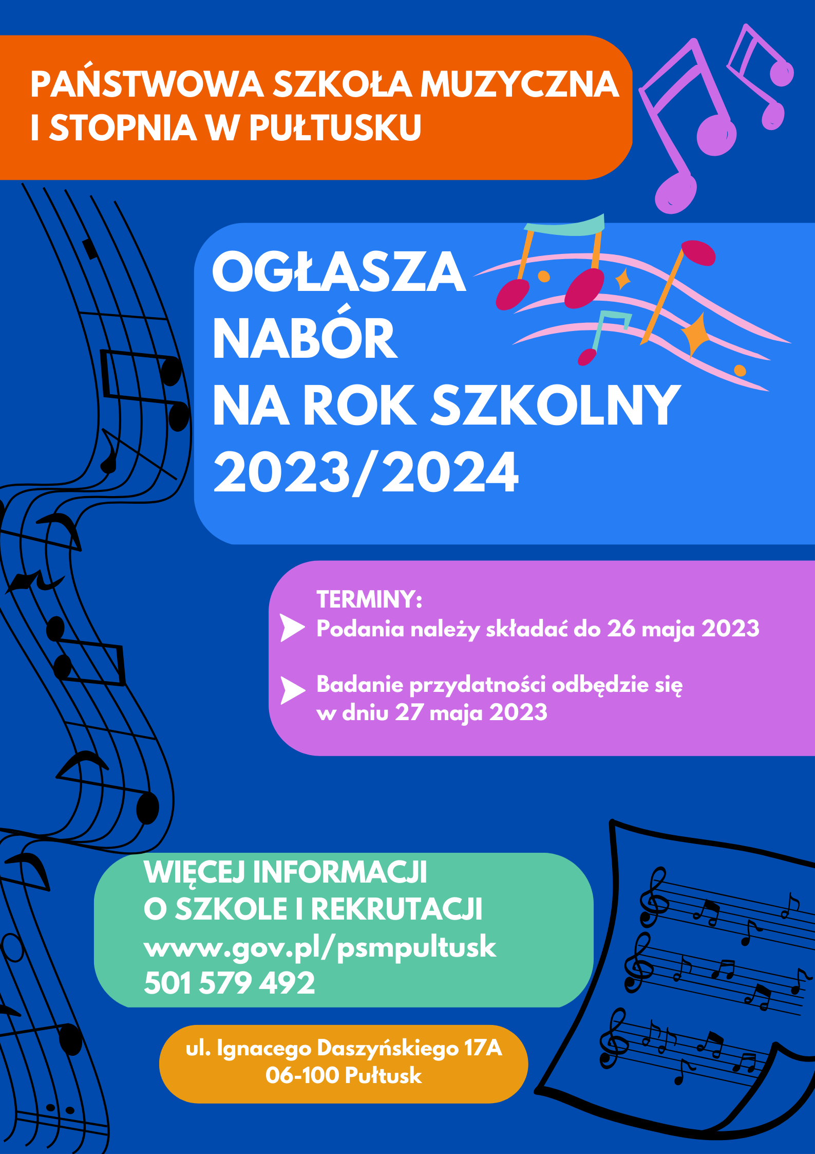Wnioski wraz z załącznikami prosimy dostarczyć do sekretariatu szkoły lub przesłać na adres: sekretariat@psmpultusk.edu.pl lub za pośrednictwem Poczty Polskiej na adres: ul. Ignacego Daszyńskiego 17A, 06-100 Pułtusk