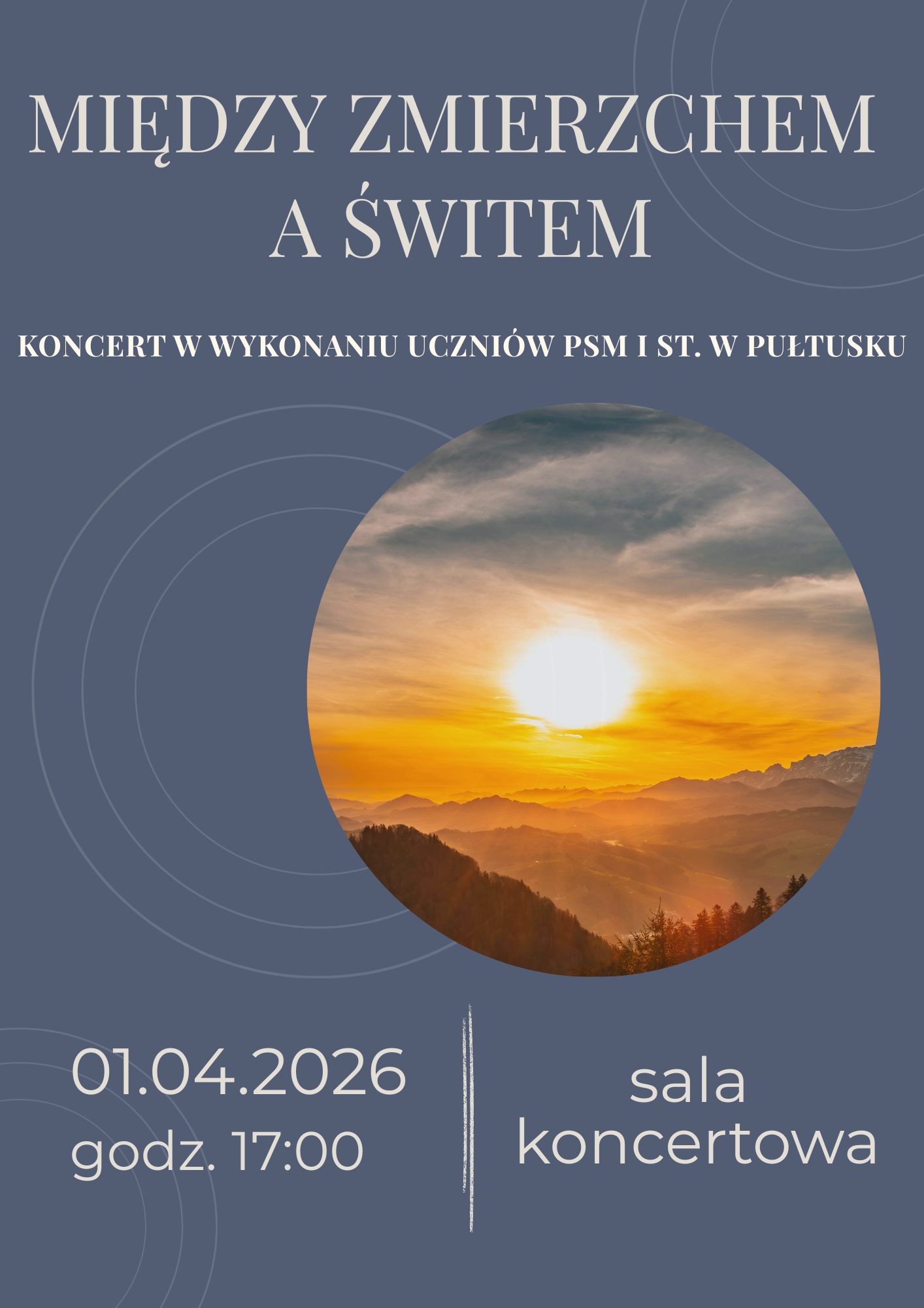 Serdecznie zapraszamy na koncert w wykonaniu uczniów naszej szkoły pt. Między zmierzchem a świtem. Koncert odbędzie się w środę 1 kwietnia o godz. 17:00 w sali koncertowej.