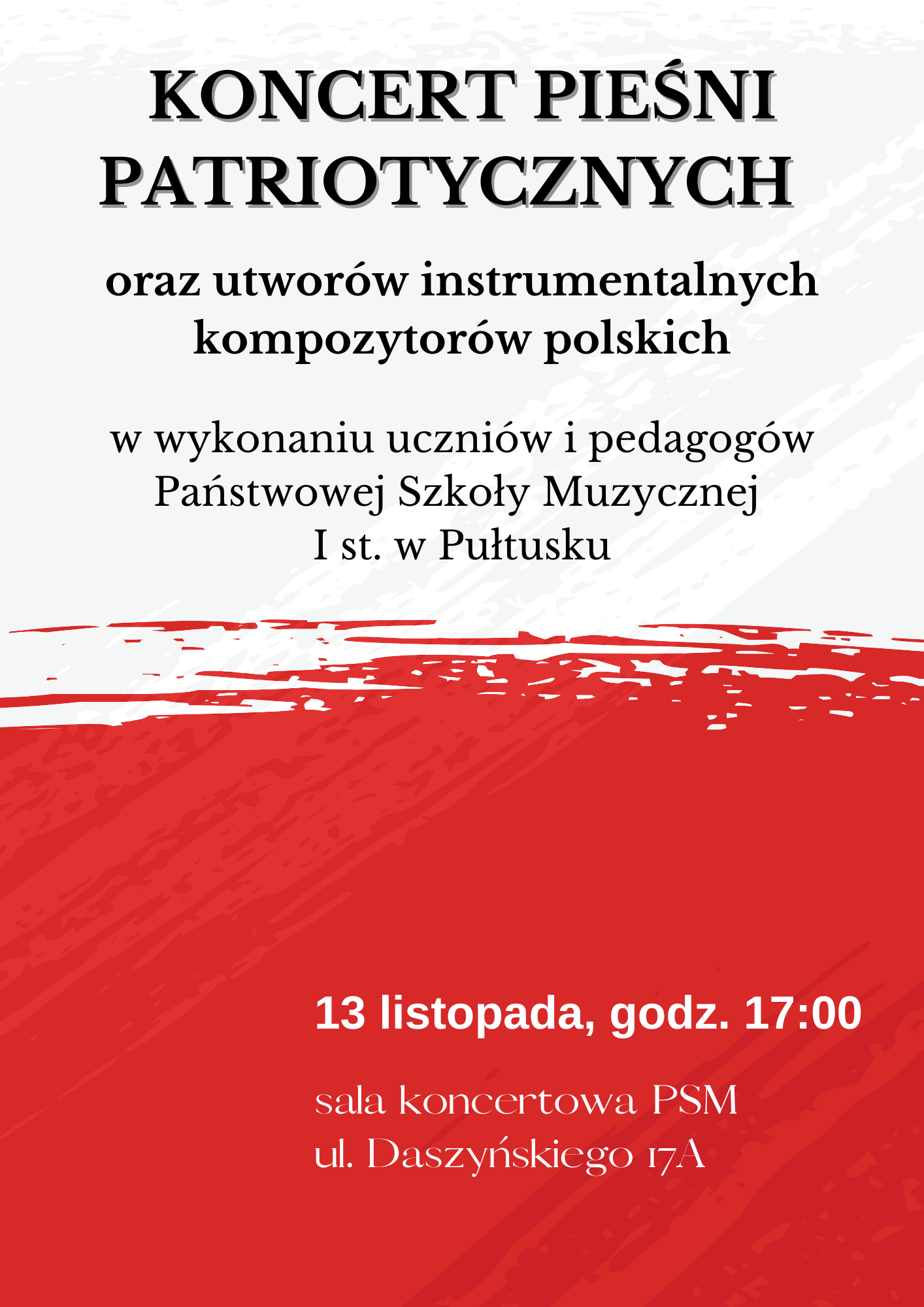 Serdecznie zapraszamy na Kocert Pieśni Patriotycznych oraz utworów instrumentalnych kompozytorów polskich w wykonaniu uczniów i pedagogów Państwowej Szkoły Muzycznej I st. w Pułtusku. Koncert będzie miał miejsce 13 listopada (środa) o godz. 1700 w sali koncertowej naszej szkoły.