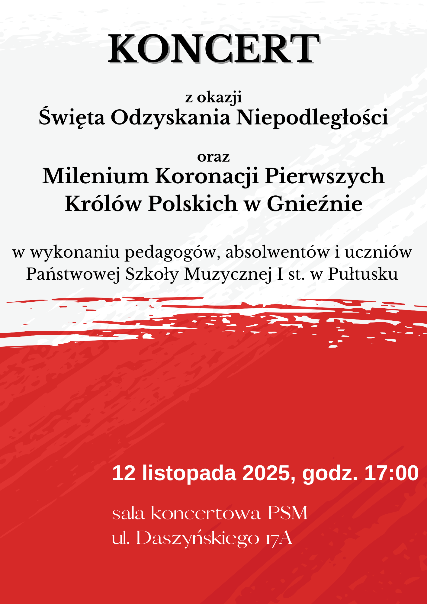 Zapraszamy na koncert z okazji Święta Odzyskania Niepodległości oraz Milenium Koronacji Pierwszych Królów Polski w Gnieźnie, który odbędzie się 12 listopada (środa) o godz. 17:00 w sali koncertowej naszej szkoły. W koncercie będziemy mogli usłyszeć utwory w wykonaniu pedagogów, absolwentów i uczniów Państwowej Szkoły Muzycznej I st. w Pułtusku.