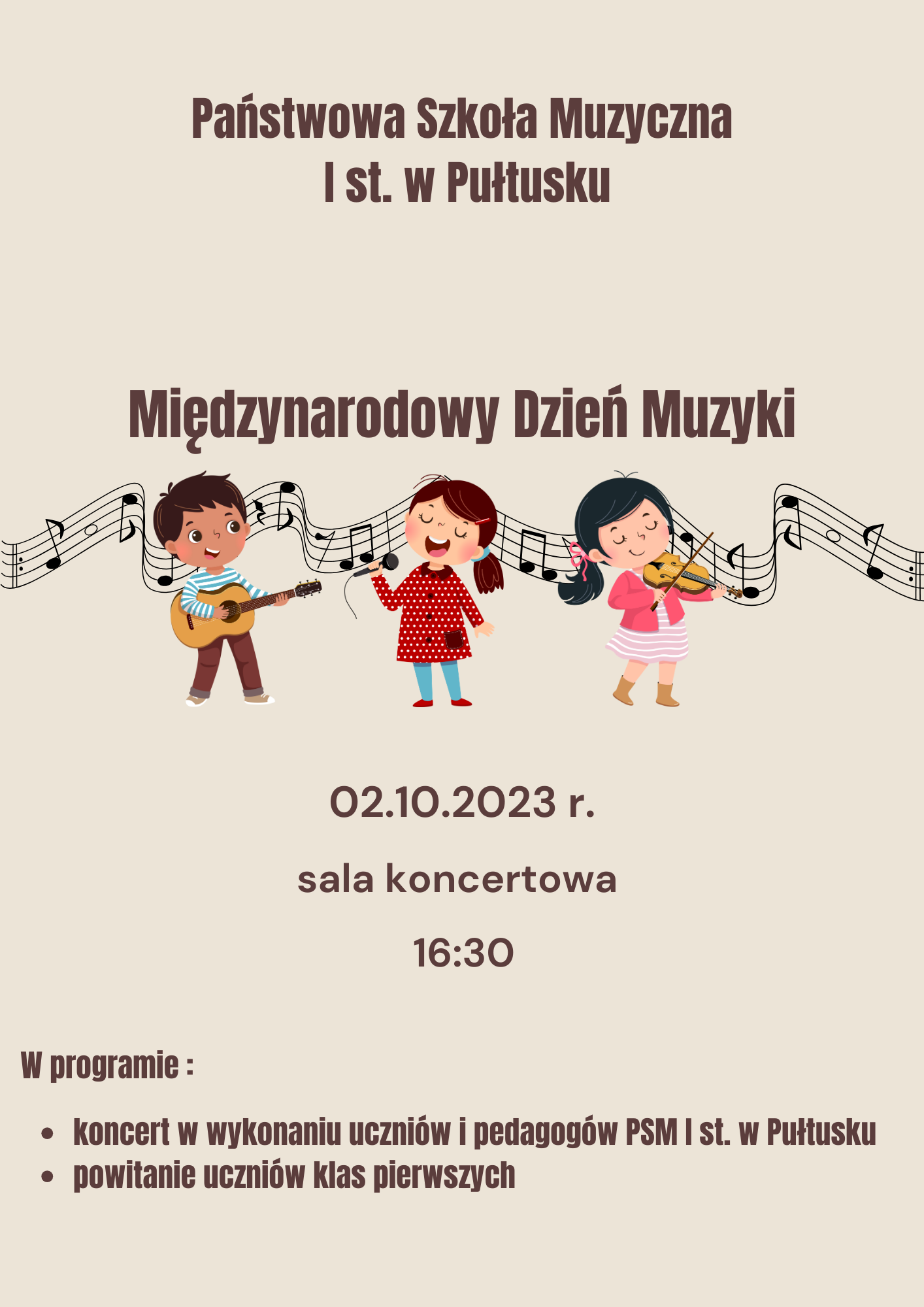 Dnia 2 października będziemy obchodzić w naszej szkole Międzynarodowy Dzień Muzyki. Z tej okazji zapraszamy wszystkich na koncert w wykonaniu uczniów i pedagogów PSM I stopnia w Pułtusku. Koncert odbędzie się w sali koncertowej o godzinie 16:30. Podczas koncertu powitamy uczniów klas pierwszych.