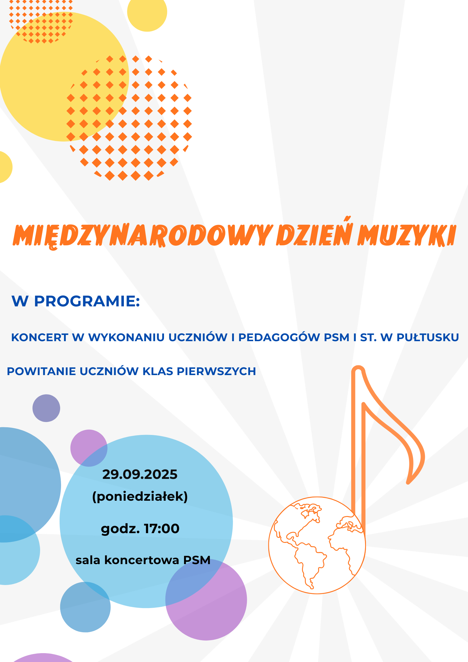 Serdecznie zapraszamy 29 września (poniedziałek) o godz. 17:00 na wyjątkowy koncert w wykonaniu uczniów i pedagogów Państwowej Szkoły Muzycznej I st. w Pułtusku. Koncert odbędzie się w ramach Międzynarodowego Dnia Muzyki. Podczas koncertu powitamy uczniów klas pierwszych.
