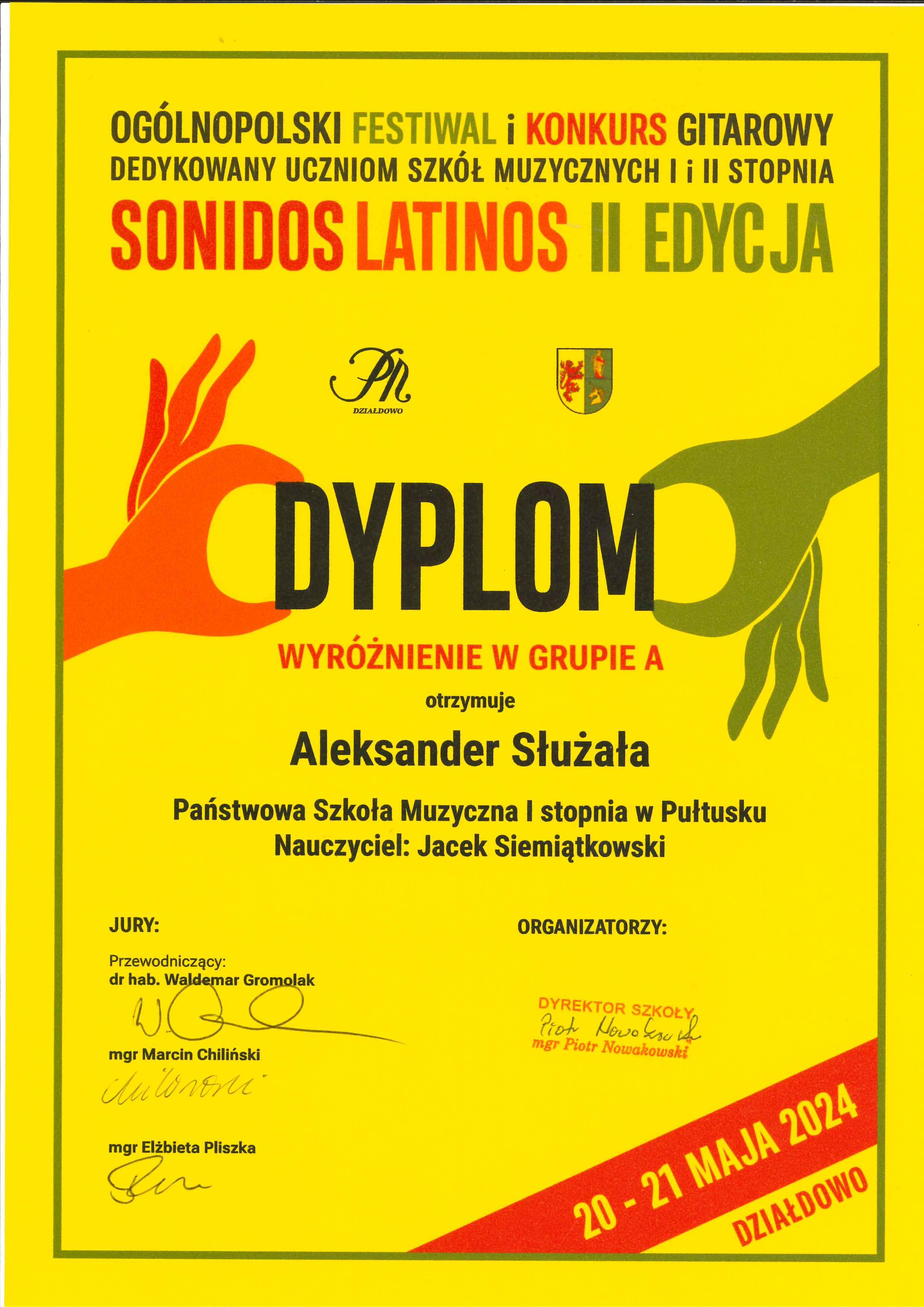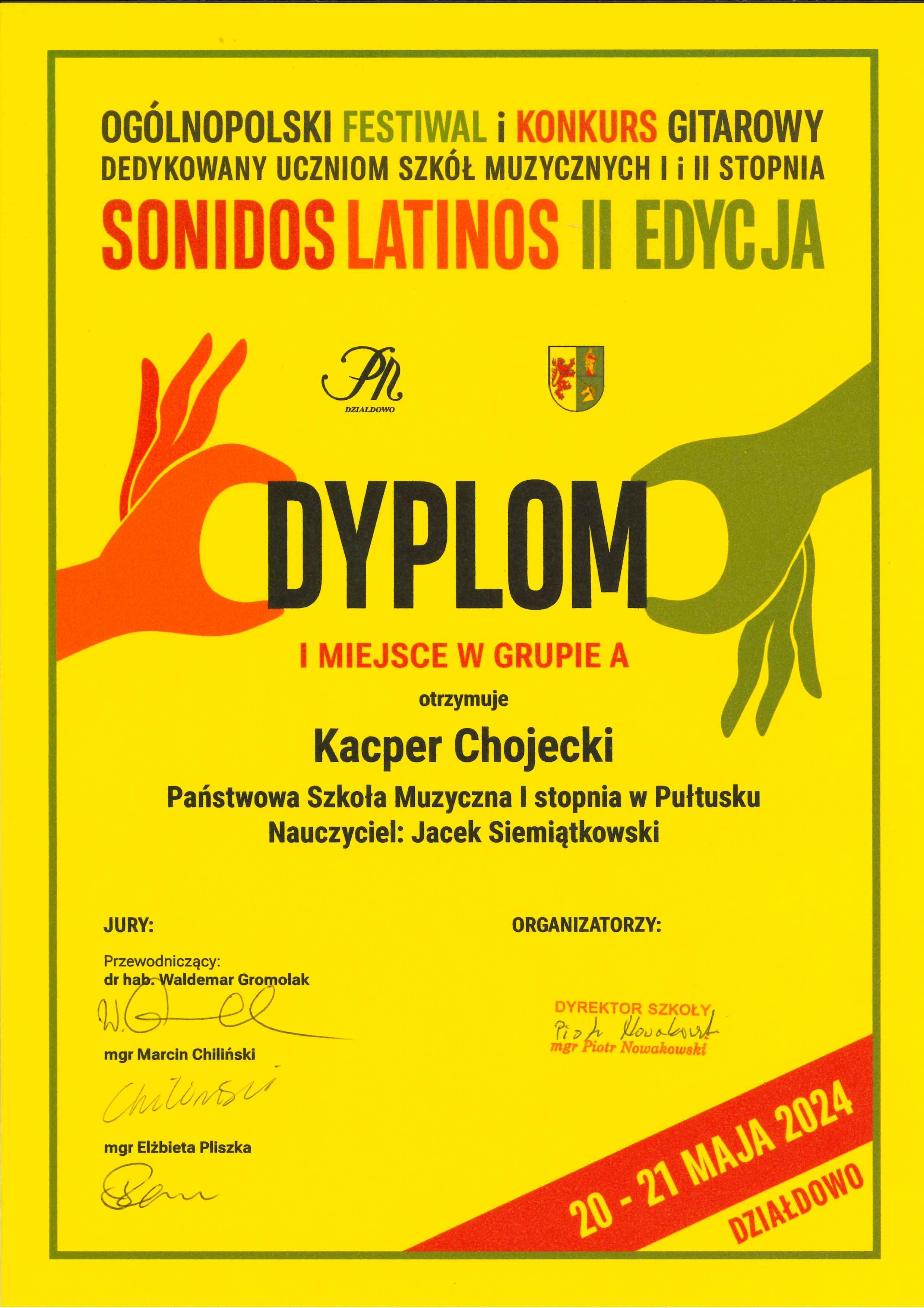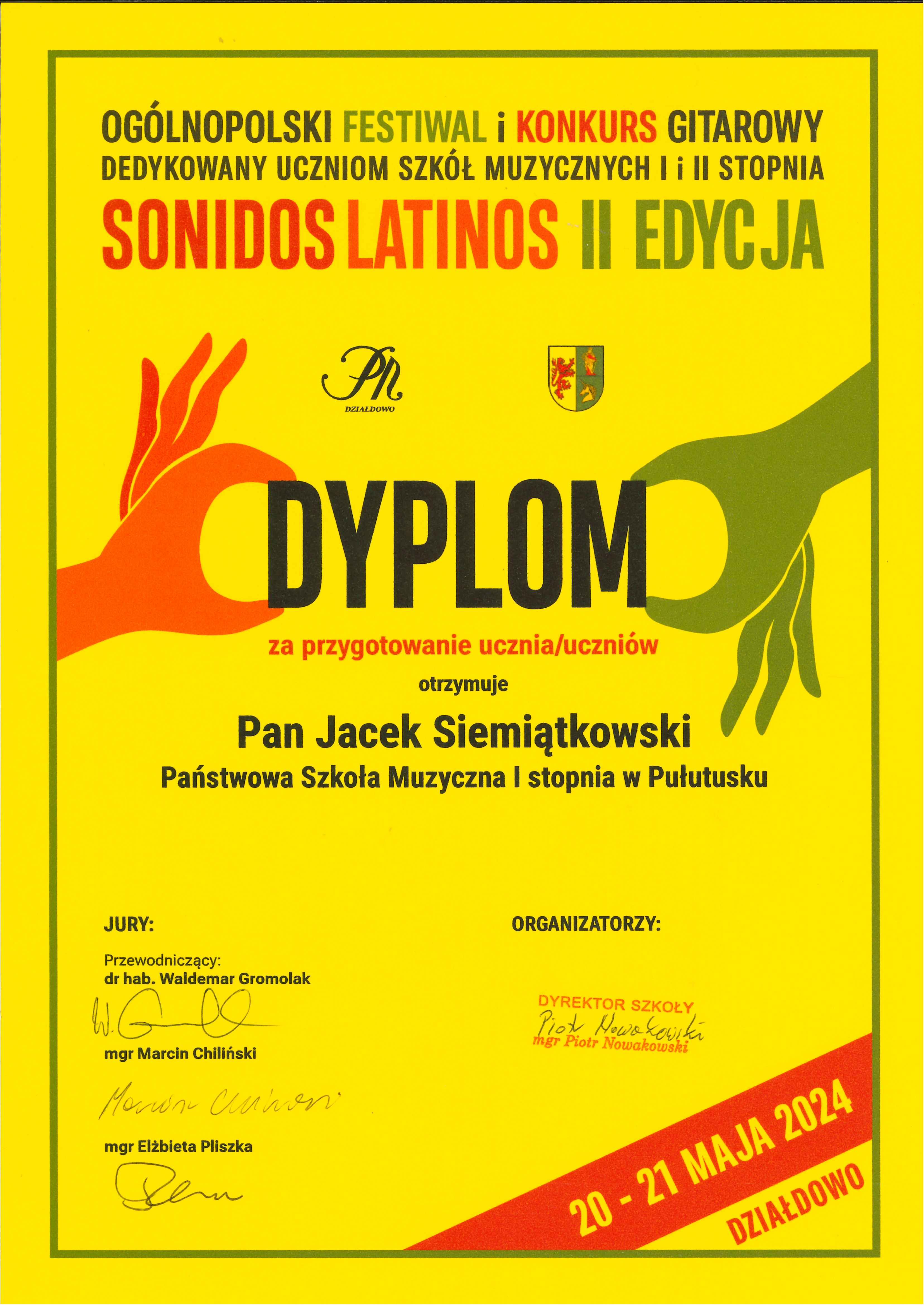 Miło nam poinformować, że uczniowie klasy gitary p. Jacka Siemiątkowskiego zostali lauretami Ogólnopolskiego Konkursu Gitarowego "Sonidos Latinos" w Działdowie.