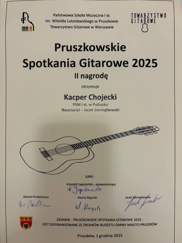 Miło nam poinformować, że Kacper Chojecki, uczeń klasy gitary pana Jacka Siemiątkowskiego, zdobył II nagrodę w Pruszkowskich Spotkaniach Gitarowych. Konkurs zorganizowany był przez PSM I st. im. Witolda Lutosławskiego w Pruszkowie.