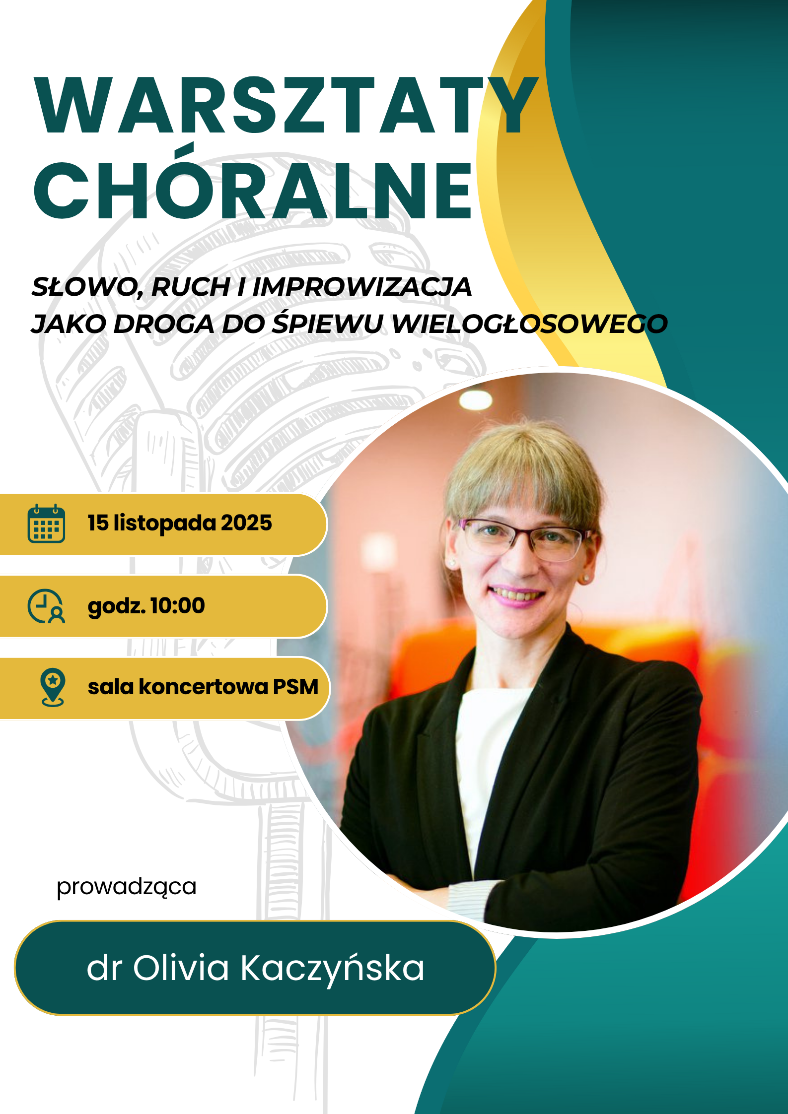 Zapraszamy na warsztaty chóralne pt. Słowo, ruch i improwizacja jako droga do śpiewu wielogłosowego, które odbędą się 15 listopada (sobota) o godz. 10:00 w sali koncertowej naszej szkoły. Warsztaty poprowadzi dr Olivia Kaczyńska.