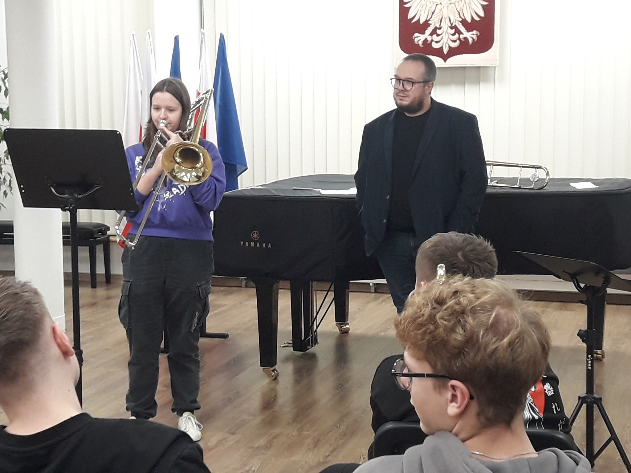 W poniedziałek, 1 grudnia, gościliśmy w naszej szkole pana Fryderyka Mizerskiego, pierwszego puzonistę Opery Wrocławskiej, absolwenta Akademii Muzycznej im. Fryderyka Chopina w Warszawie, a obecnie wykładowcę Akademii Muzycznej im. Ignacego Jana Paderewskiego w Poznaniu.