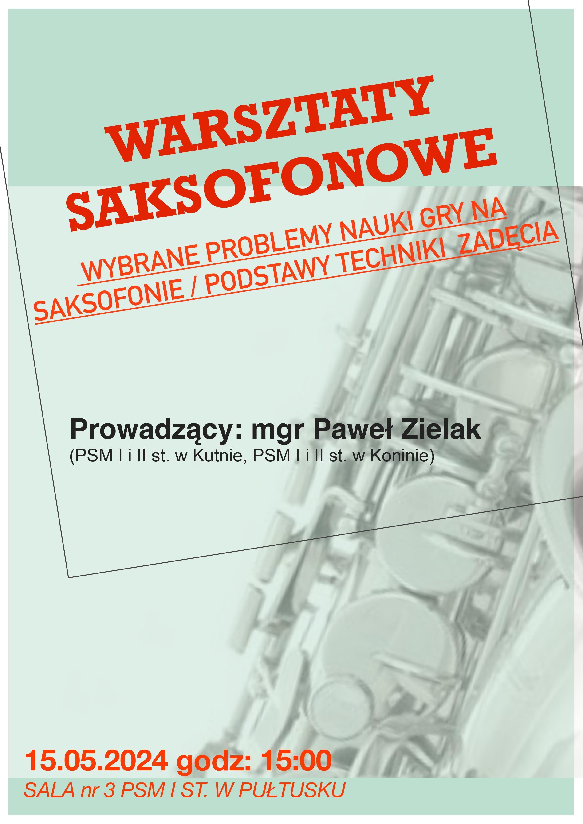 Zapraszamy na warsztaty saksofonowe, które odbędą się 15 maja o godzinie 1500 w sali nr 3 PSM I st. w Pułtusku.