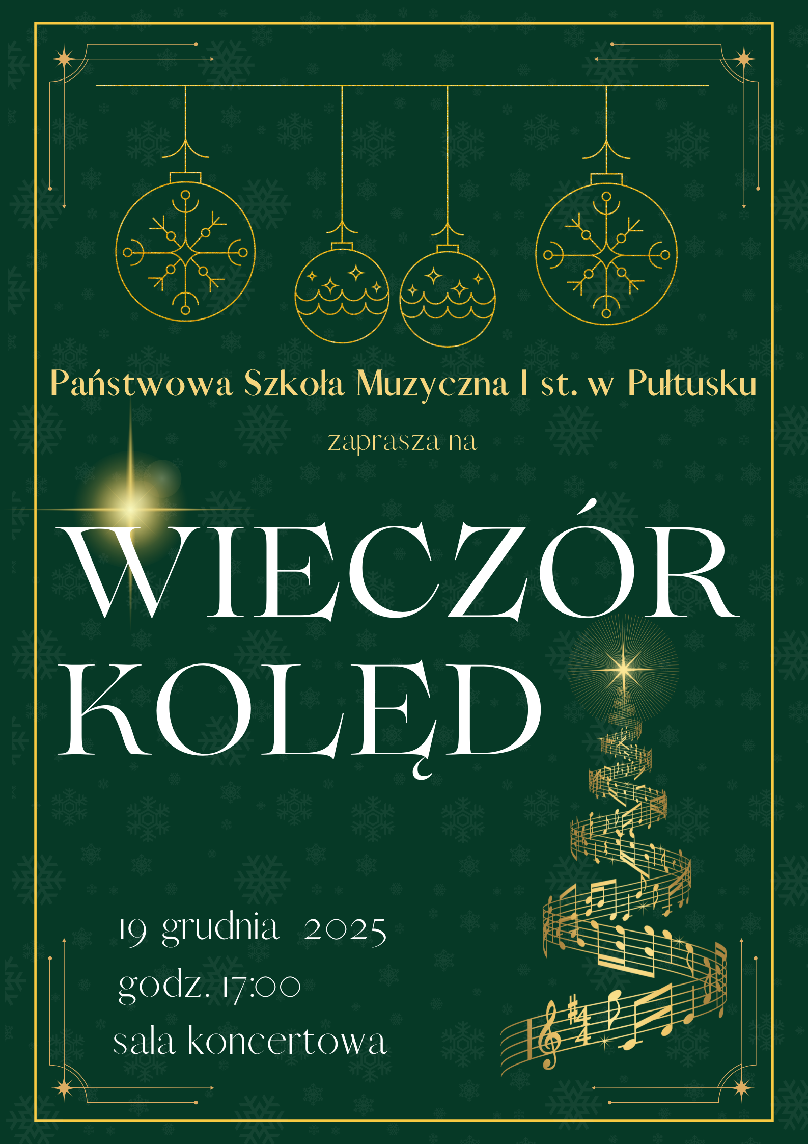 W oczekiwaniu na ten magiczny czas zapraszamy Państwa na Wieczór Kolęd, który odbędzie się 19 grudnia (piątek) o godz. 17:00 w sali koncertowej naszej szkoły.