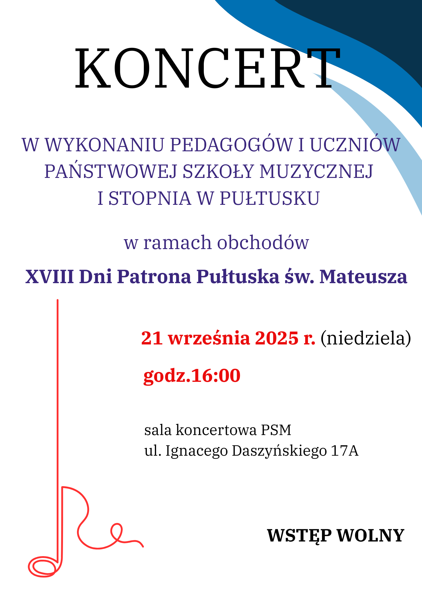 Już w tym tygodniu w naszym mieście obchodzić będziemy XVIII Dni Patrona Pułtuska św. Mateusza. Z tej okazji zapraszamy wszystkich na koncert w wykonaniu pedagogów i uczniów naszej szkoły. Koncert odbędzie się w niedzielę 21 września o godzinie 1600 w sali koncerowej Państwowej Szkoły Muzycznej I st. w Pułtusku przy ulicy Ignacego Daszyńckiego 17A.