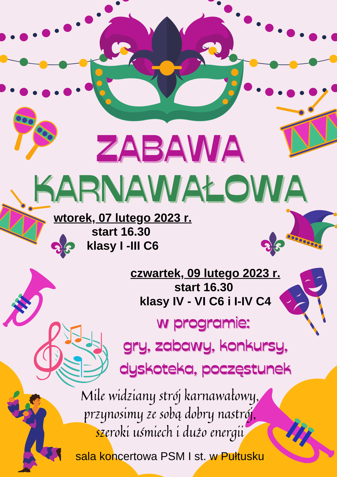 Serdecznie zapraszamy wszystkich uczniów na zabawę karnawałową, która odbędzie się 07 lutego 2023 r. dla młodszych dzieci oraz 09 lutego 2023 r. dla dzieci starszych. Szczegóły na plakacie.