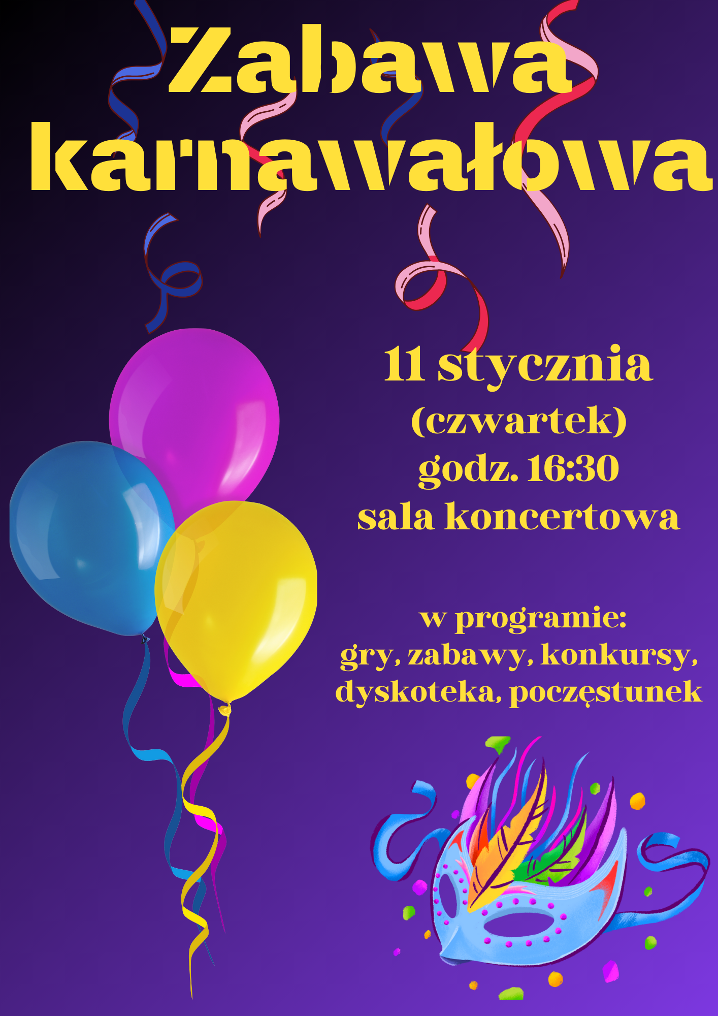 Już 11 stycznia (czwartek) w naszej szkole odbędzie się zabawa karnawałowa. W programie moc atrakcji. Gry, zabawy, konkursy oraz dyskoteka i poczęstunek. Zapraszamy o 1630 do sali koncertowej. Mile widziane stroje karnawałowe.