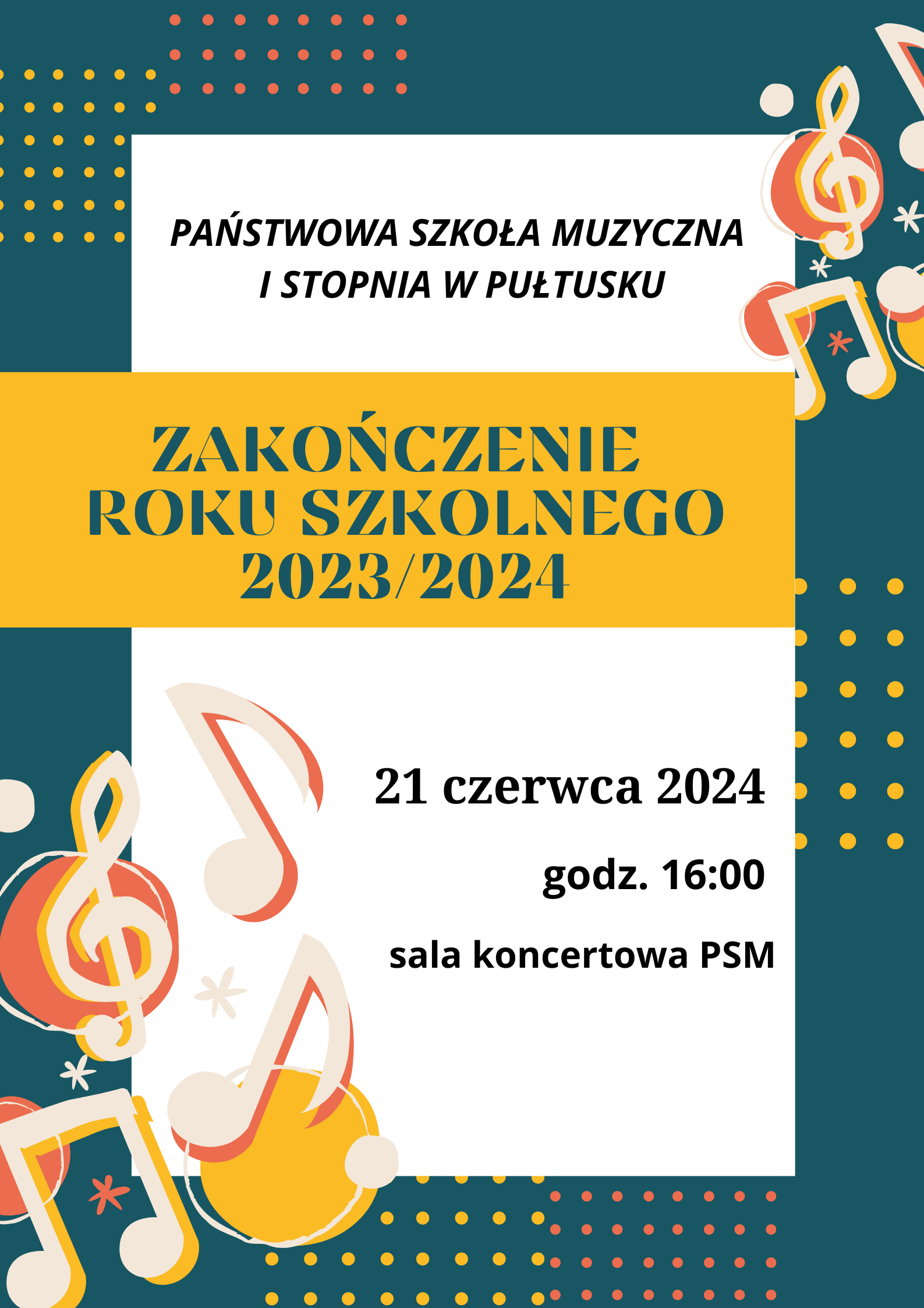 Zakończenie roku szkolnego 2023/2024 odbędzie się 21 czerwca o godz. 16:00 w sali koncertowej naszej szkoły. Serdecznie zapraszamy.