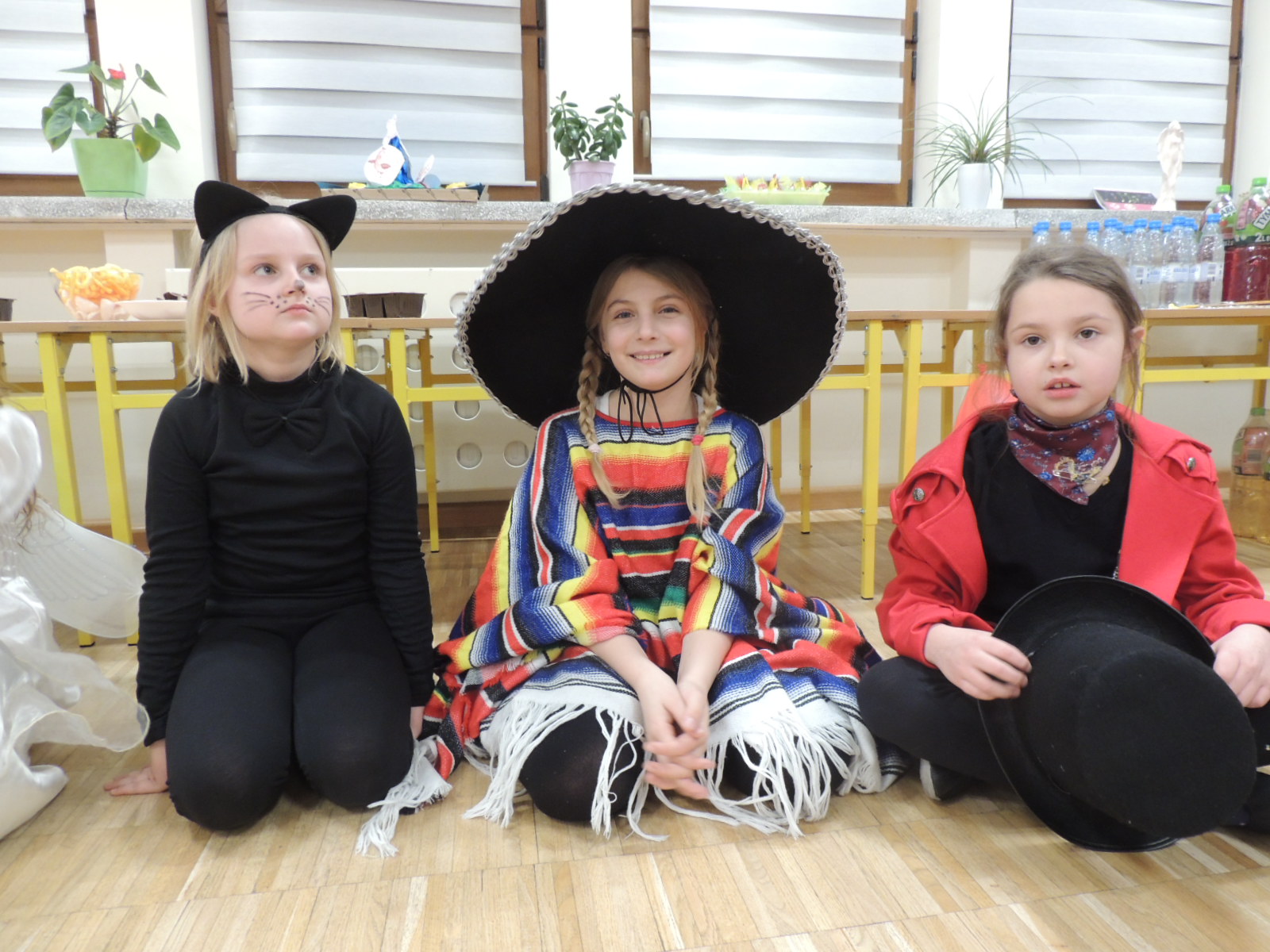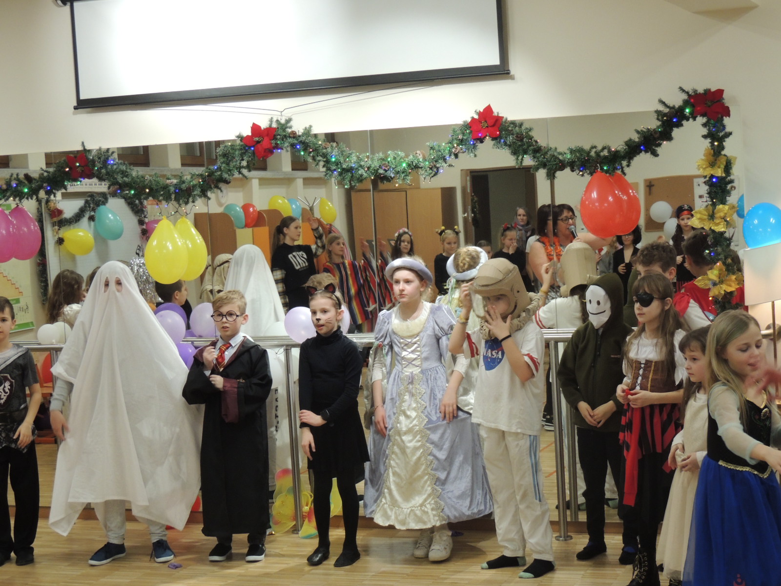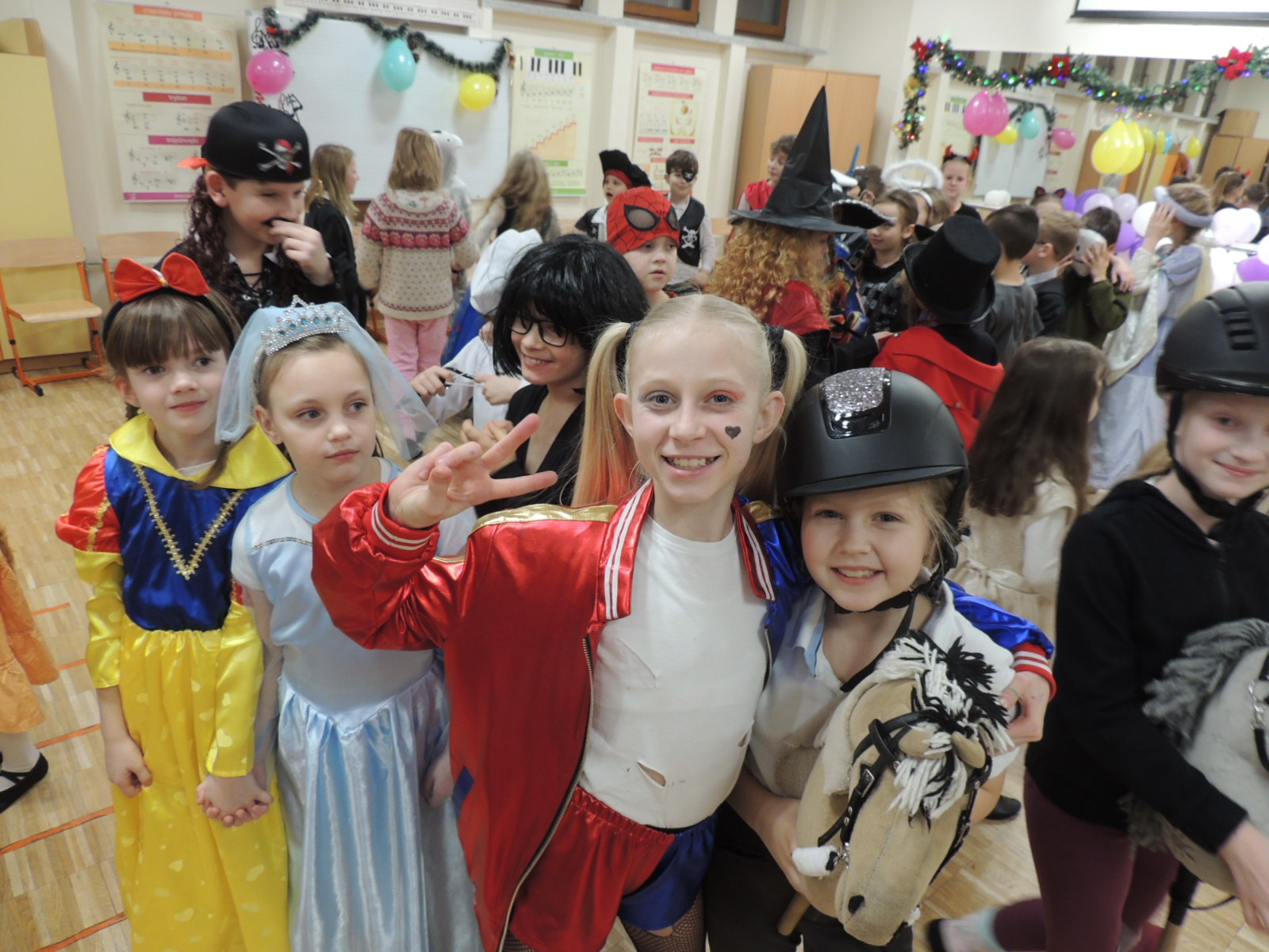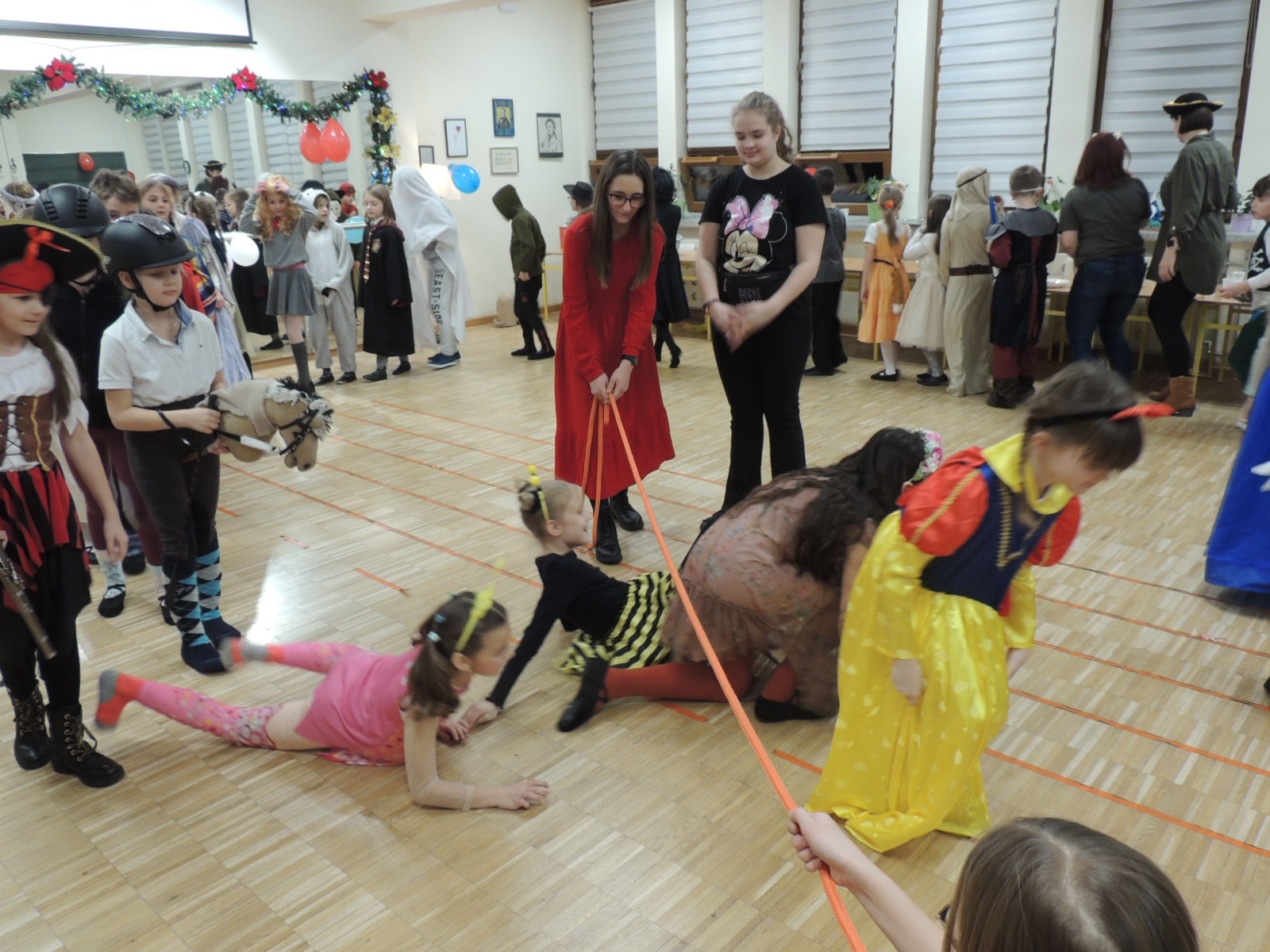 Oj działo się, działo! 12 stycznia zawitali do naszej szkoły niezwykli goście, kogo tam nie było...postacie z bajek, z filmów, ze świata zwierząt, duchów, a nawet przedstawiciele służby zdrowia :). Już przed godziną 16:00 na korytarzach szkoły zrobiło się gwarno i kolorowo, a od 16:00 zaczęła się zabawa. Tańców, zabaw, śmiechu nikt nie zliczy, bawił się kotek z królewną, rycerz z doktorem, Hermiona z duchem. Utrudzeni tańcem goście zasiadali do smacznych przekąsek i napojów, których rodzajów było co niemiara. Panie: Basia - główny wodzirej, Ewelina - szlachetna piratka, Gabrysia - wesoły kotek, Asia - rudy kotek oraz pan Piotr - czarodziej klawiatury nadawali tempo i rytm zabawie. Kolejny taki bal w przyszłym roku w karnawale, zapiszcie w terminarzach, takiego wydarzenia nie można przegapić. Do zobaczenia!