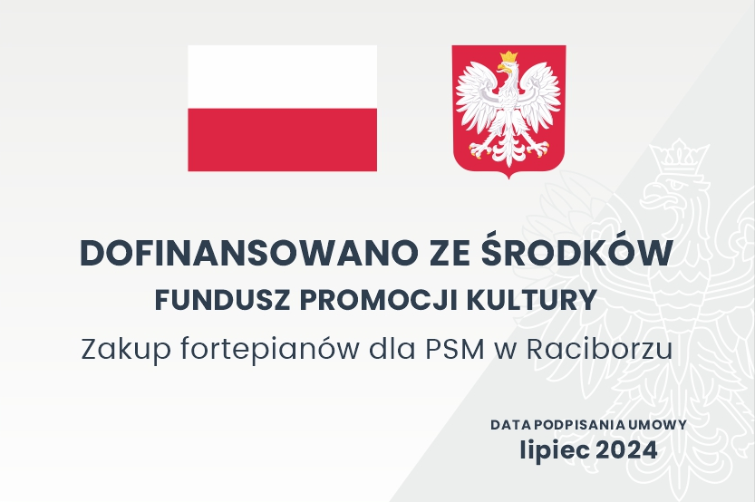 Zadanie „Zakup fortepianów dla PSM w Raciborzu” dofinansowano ze środków finansowych Ministra Kultury i Dziedzictwa Narodowego pochodzących z Funduszu Promocji Kultury – państwowego funduszu celowego.