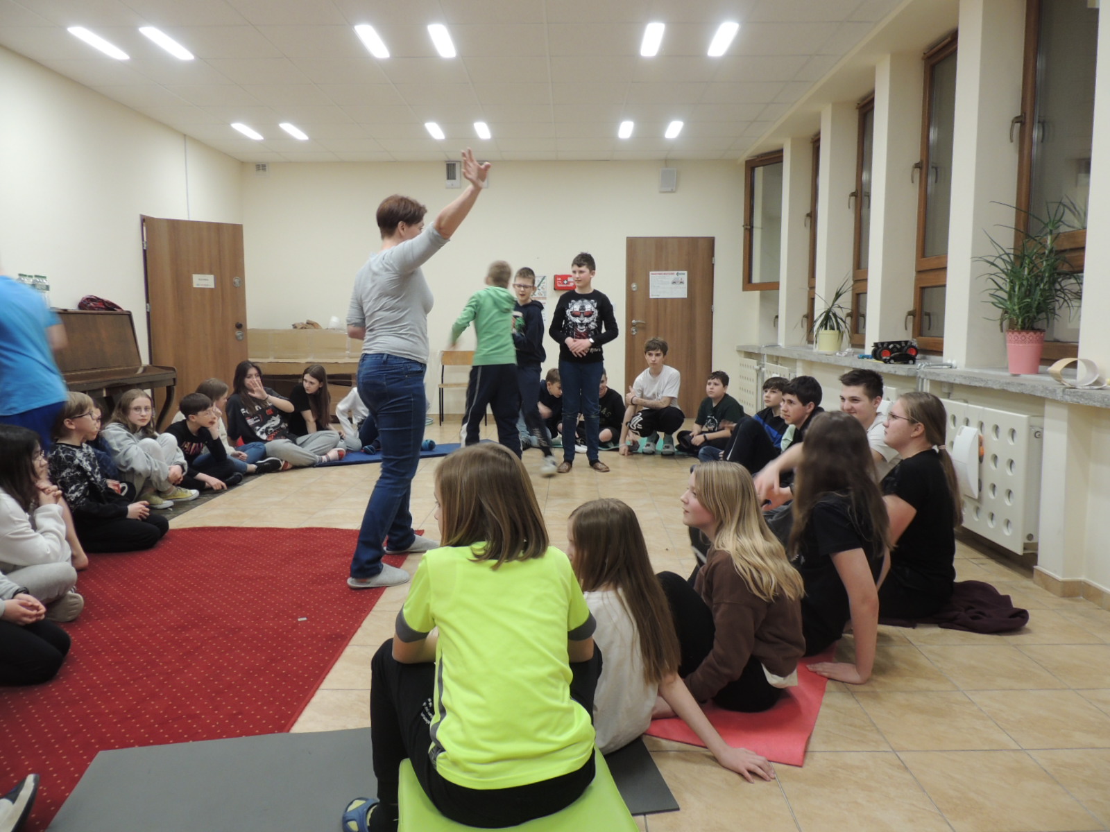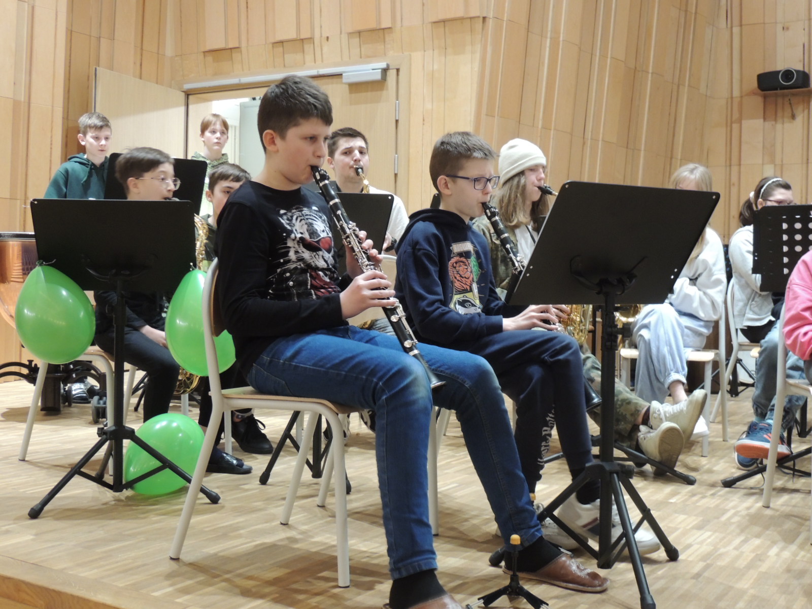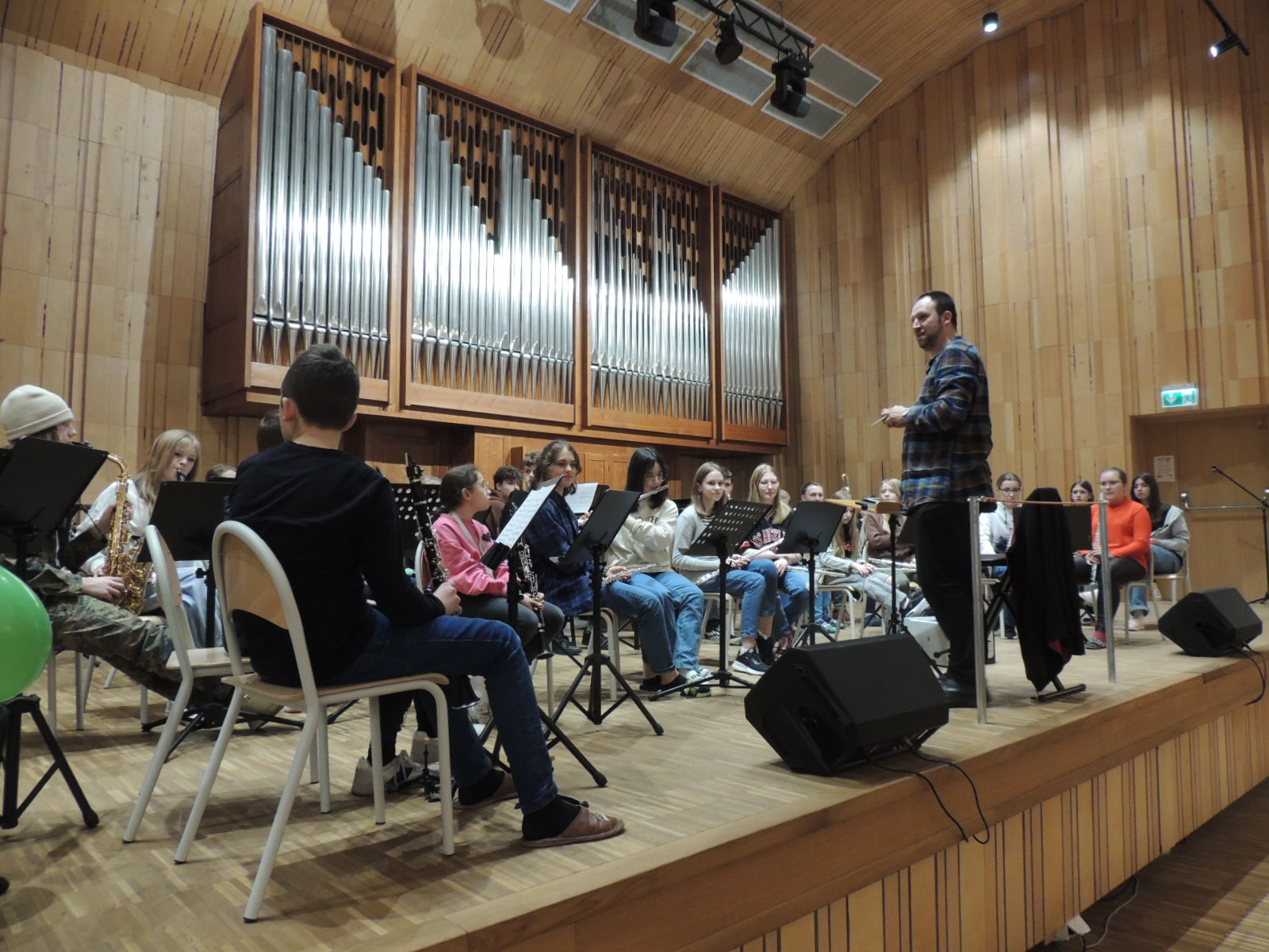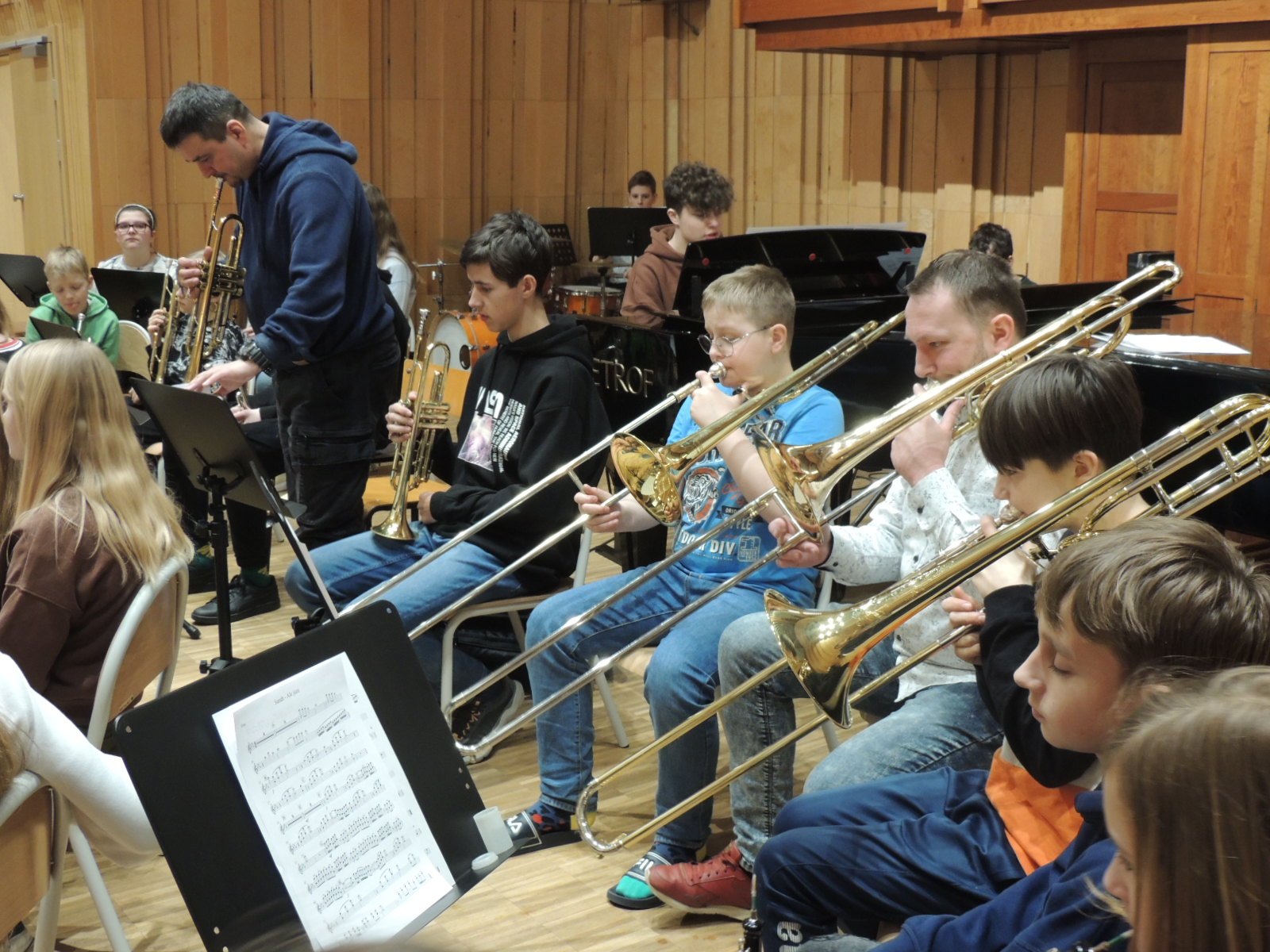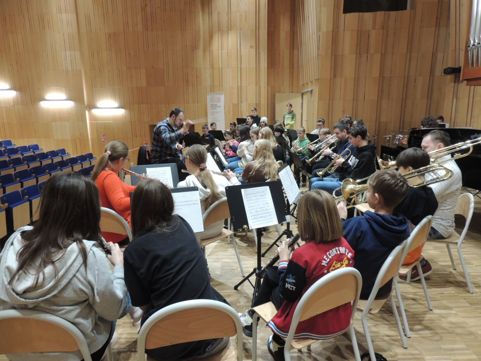 Piątek 17 marca 2023 godzina 16.00: obok popiersia Stanisława Moniuszki w holu szkoły zaczynają gromadzić się rodzice ze swoimi pociechami - uczniami szkoły muzycznej. Tym razem oprócz instrumentów przynieśli ze sobą karimaty i śpiwory. Ten widok niechybnie oznacza, że wreszcie doczekaliśmy się kolejnej edycji weekendowych warsztatów. Po długiej, pandemicznej przerwie trzy kolejne marcowe weekendy zarezerwowaliśmy na pracę w zespołach. Na pierwszy ogień poszli „dęciacy”. Uczniowie zespołu instrumentów dętych połączonych z zespołem jazzowym spędzili pracowity czas. Intensywne próby: piątek 17.03: 17.00 – 19.15, sobota 9.45 – 13.30 oraz 17.15 – 19.15, niedziela 9.45 – 13.30 i koncert 16.00. Nad pracą na próbach czuwał dr Klaudiusz Jania – na co dzień pracownik Akademii Muzycznej im Karola Szymanowskiego w Katowicach. Maestro poprowadził również niedzielny koncert. Żeby urozmaicić czas spędzony na instrumentalnej pracy oraz zintegrować się jeszcze lepiej jako zespoły nauczyciele przygotowali mnóstwo atrakcji dla dzielnych podopiecznych sekcji instrumentów dętych. Piątkowy wieczór uczniowie podzieleni na cztery drużyny szukali schowanych w całej szkole zadań muzycznych do których prowadziły zagadki, które również trzeba było znaleźć. W sobotę zamiast sjesty poobiedniej o aktywnie spędzony czas na sali gimnastycznej zadbali nauczyciele wychowania fizycznego zaprzyjaźnionego Centrum Kształcenia Zawadowego i Ustawicznego (nasi sąsiedziJ). Również w sobotę po kolacji na wieczorze integracyjnym graliśmy w kalambury, strzelające owoce i przeprowadziliśmy za pomocą cudzych rąk wywiad z gwiazdą filmową (kto był – wie o co chodzi a kto nie był, niech żałuje!).
