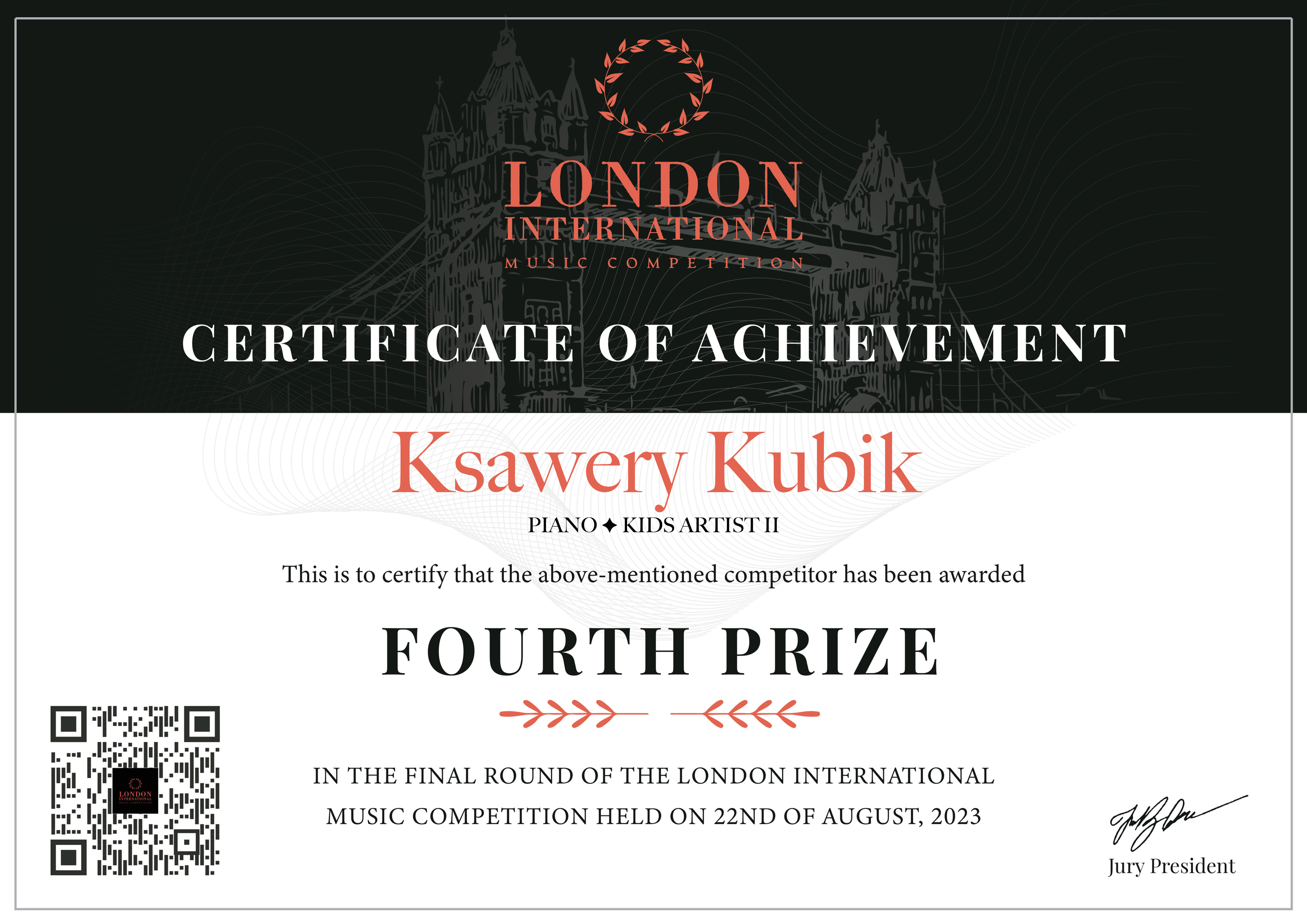 Ksawery Kubik z klasy fortepianu p. Hanny Rodzoń, zdobył IV MIEJSCE w konkursie: London International Music