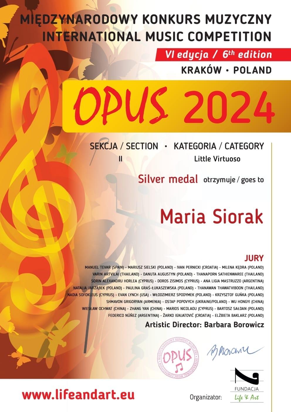 Wiolonczelistka Maria Siorak w Międzynarodowym Konkursie Muzycznym OPUS 2024 w kategorii Mały Wirtuoz otrzymała Srebrny medal. Marysię przygotowała pani Ewelina Mrozek. To był owocny rok dla Marysi.