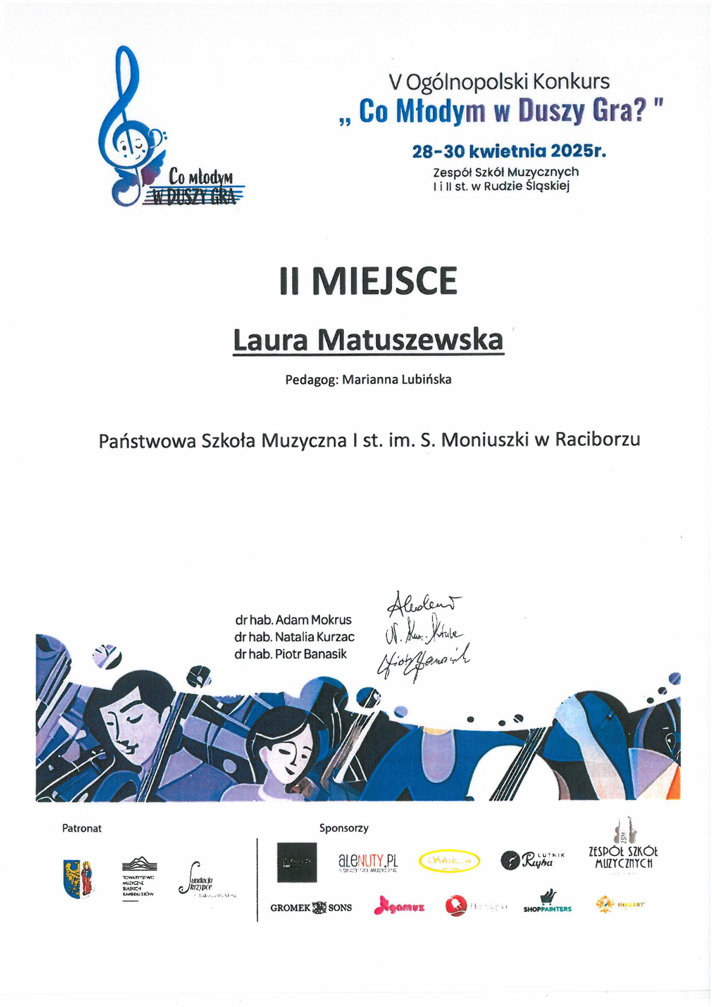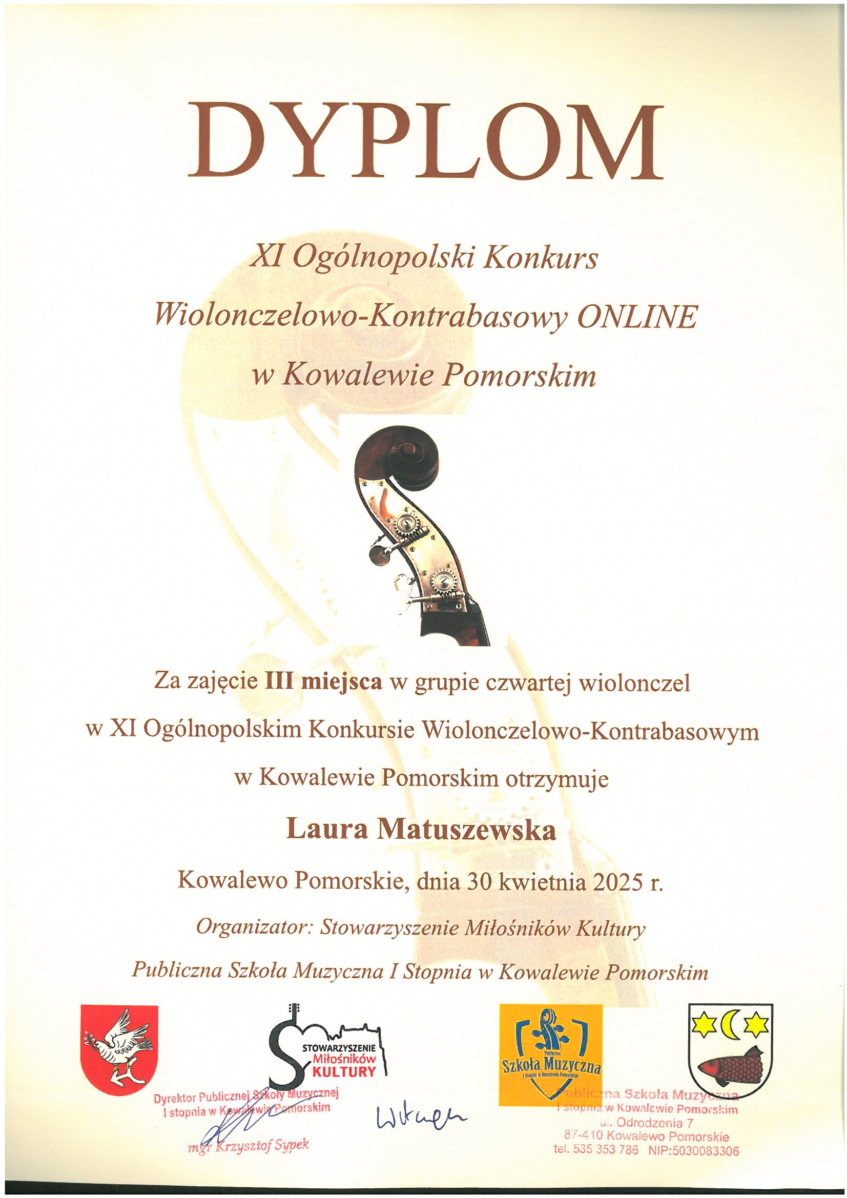 28-30 kwietnia 2025r. Laura Matuszewska kl. II c4, uczennica klasy wiolonczeli Marianny Lubińskiej zdobyła II miejsce w V Ogolnopolskim Konkursie "Co Młodym w Duszy gra" w Rudzie Śląskiej oraz III miejsce w grupie IV wiolonczel w XI Ogólnopolskim Konkursie Wiolonczelowo-Kontrabasowym w Kowalewie Pomorskim, który odbył się w edycji online - w kwietniu tego roku.