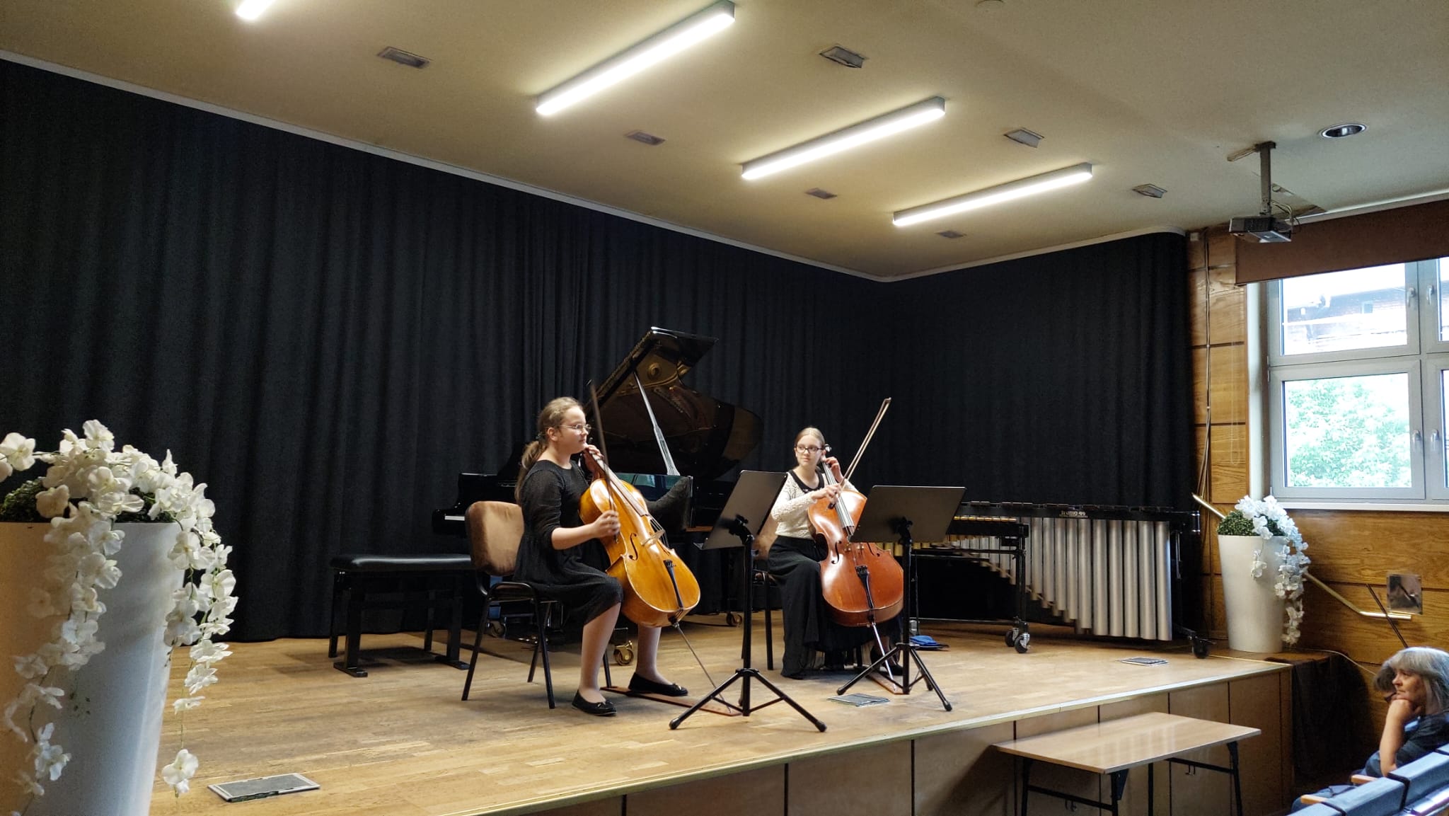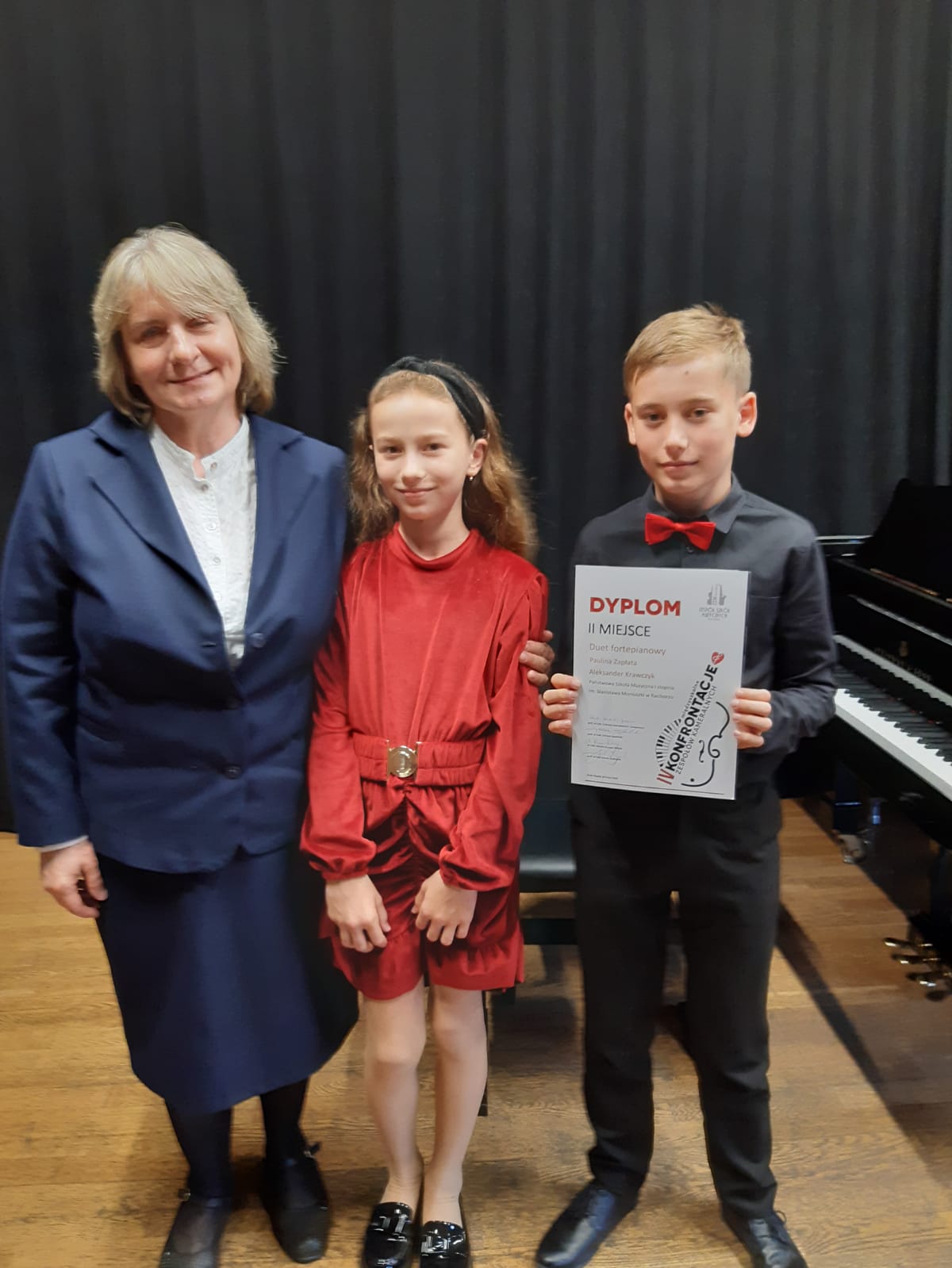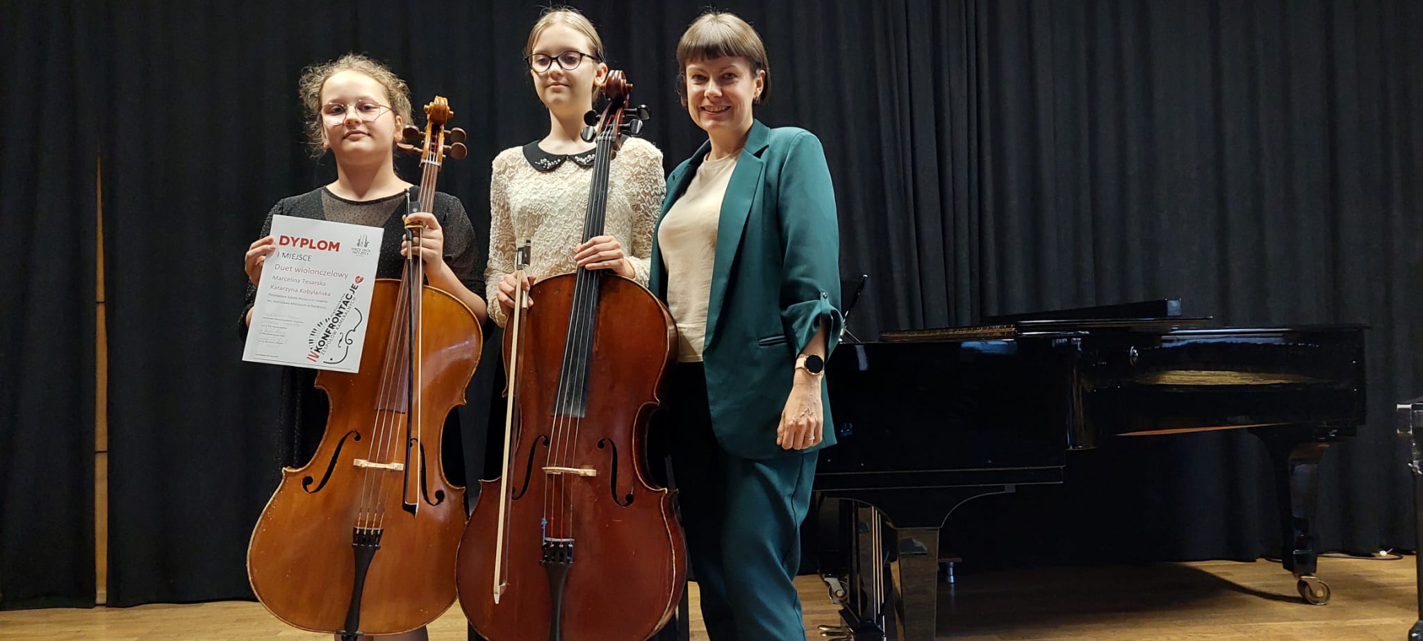 26.05.2023 w Rudzie Śląskiej, odbyły się IV Międzyszkolne Konfrontacje Zespołów Kameralnych. W Konfrontacjach brały udział nie tylko zespoły z województwa śląskiego, ale także znalazły się reprezentacje z Krakowa i Wrocławia. Naszą szkołę reprezentowały dwa zespoły. Pierwszy to duet fortepianowy z klasy pani Elżbiety Włosek-Żurawieckiej w składzie: Paulina Zapłata, Aleksander Krawczyk. Drugi zespół to duet wiolonczelowy KaMaCelli w składzie: Katarzyna Kobylańska i Marcelina Tesarska z klasy pani Eweliny Mrozek. Oba duety znakomicie zaprezentowały się na konkursie. Duet wiolonczelowy KaMaCelli zdobył I miejsce, natomiast duet fortepianowy II miejsce. Oba zespoły wystąpiły na koncercie laureatów. Paulina i Aleksander wybrali na te okazję utwór Janiny Garści – Kotek i myszka, natomiast Kasia i Marcelina zostały poproszone o wykonanie na koncercie ich własnej kompozycji – Podróż w nieznane.