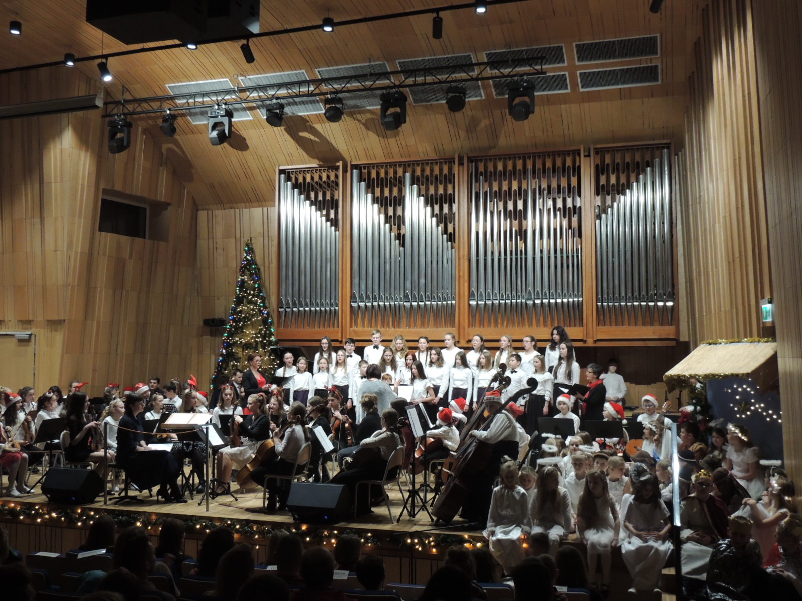Po uroczystym rozpoczęciu Fanfarą wykonaną na werblu, ciemną salę oświeciły malutkie lampiony aniołków z klasy II i III. Następnie przez świąteczną opowieść przeprowadzał nas to głos narratora i kolędy wykonywane przez zespoły instrumentalne, wokalne, dęte, jazzowe oraz perkusyjne, duety, przeplatane wykonaniami orkiestrowymi i chóralnymi. Pastuszkowie i Trzej Królowie otoczeni Aniołkami pokłonili się narodzonemu Jezusowi, a całość uwieńczyło wspólne wykonanie Merry Christmas Everyone.