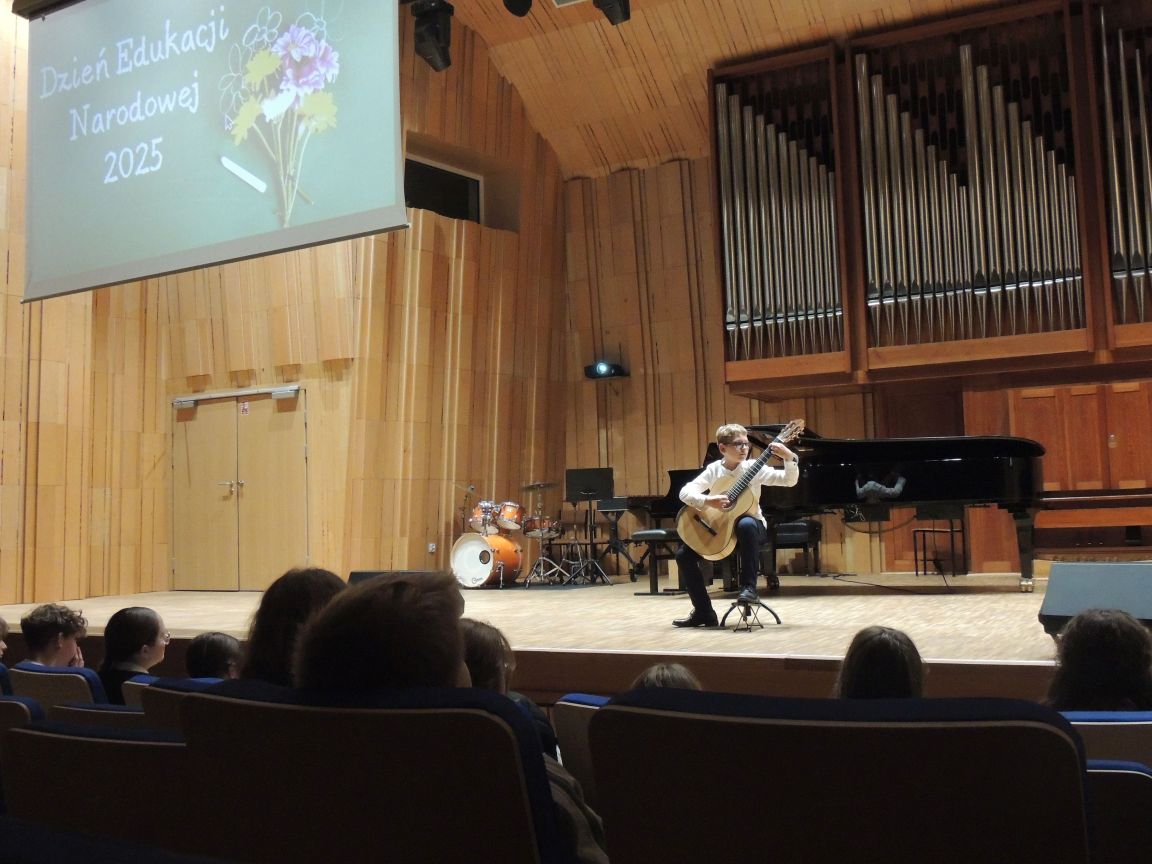 Dnia 13.10.2025 odbył się w naszej szkole koncert z okazji Dnia Edukacji Narodowej. Tradycyjnie, koncert ten jest przygotowywany przez uczniów dla nauczycieli, by uczniowie mogli w ten sposób podziękować nauczycielom za ich pracę. Podczas mini koncertu wystąpili soliści, jak również zespoły, które poza muzyką klasyczną, wykonały również słynny klasyk rocka „We will rock you” (Cały program koncertu poniżej). Uczniowie po koncercie zebrali gromkie brawa, co oznaczało, że ich pomysł na koncert spodobał się publiczności. Po owacjach, uczennice prowadzące koncert: Eliza Stefanides oraz Helena Socha, zapowiedziały krótki filmik, w którym nauczyciele naszej szkoły wspominali, jak wychodziło im ćwiczenie na instrumencie, gdy sami byli uczniami.